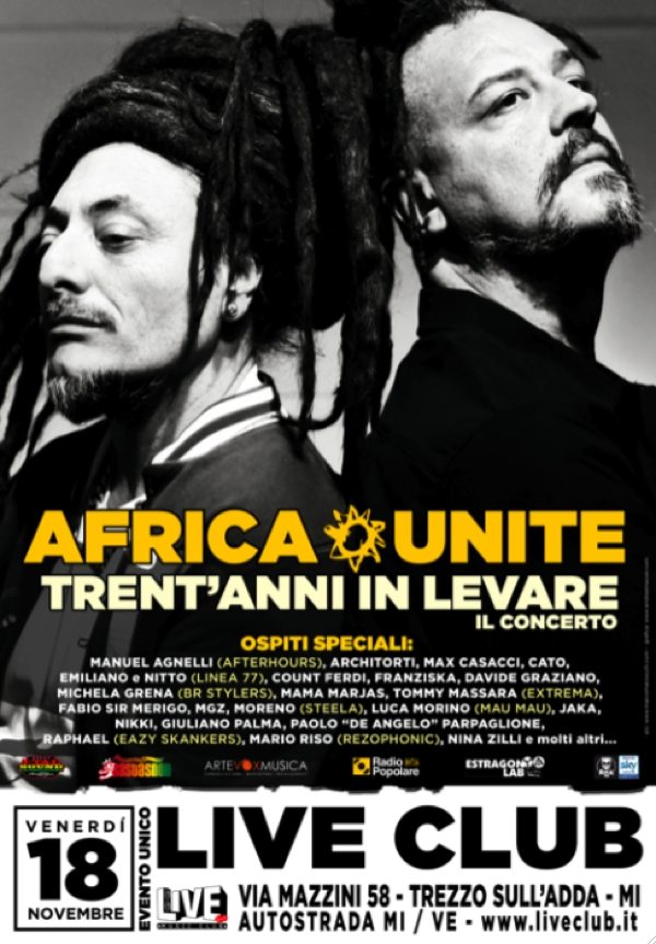 Il concerto, che si intitola “Trent’anni in levare“, vedrà sul palco del Live Club tutti gli amici e gli ospiti degli Africa: da Manuel Agnelli degli Afterhours a Max Casacci dei Subsonica, da Tommy Massara degli Extrema a Luca Morino dei Mau Mau, da Giuliano Palma a Moreno degli Steela, da Nina Zilli a Mario Riso, dai Casino Royale a Emiliano e Nitto dei Linea 77, per non parlare di tutti gli Africa Unite riuniti sotto il sax di Paolo “De Angelo” Parpaglione.