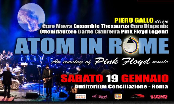 Atom in Rome è lo spettacolo che sarà in scena all’Auditorium della Conciliazione di Roma, celebrativo la musica targata Pink Floyd, il prossimo Sabato 19 Gennaio 2013 (data sold-out) e in replica Sabato 9 Febbraio 2013. Rivive così la magia della musica dei Pink Floyd, un viaggio mistico su quel che fu il fenomeno rock che invase la scena musicale negli anni ’70, sospeso tra il revival e l’innovazione, gli anni in cui il mercato discografico era sull’orlo del declino, gli anni in cui il progressive rock ha segnato una svolta i cui effetti sono palesi ancora oggi.