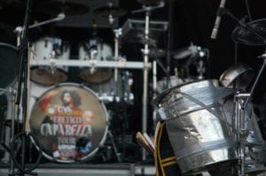E così si aprono i cancelli alle ore 20:00. Nel frattempo è un continuo via vai di persone che salgono e scendono su e giù il viale che collega la piazza di Giffoni al Campo Sportivo. La maggior parte erano giovani, ma anche famiglie con bambini a seguito (una signora con il marito ed il figlio di appena 3 anni scherzosamente affermano che il desiderio di assistere a questo cocnerto lo ha manifestato il figlio) ed anche una coppia di nonni che volentieri accompagnano i nipotini. Tutti quelli in prima fila attaccati alle transenne erano lì per vedere Caparezza, ma i Capone & BungtBangt non hanno certo subito questo gap. Anzi, si presentano sul palco alle 21 e 30 dopo il saluto da parte del Presidente storico del Giffoni Film Festival – Claudio Gubitosi che si lascia andare dicendo due sole parole che hanno dato un tono diverso alla serata: “Grazie, ragazzi!”; i Capone & Bungt Bangt prendono posizione dietro i loro strumenti artigianali di cui una chitarra costruita con una mazza di scopa e collegata tramite jack all’amplificatore con tanto di 6 corde, una batteria formata da una cassa ricavata con una botte di ferro e riempita all’interno con dei pannelli fono isolanti, un tom ed un timpano ricavati con delle latte di alluminio, un rullante, un charleston ed un crash, un basso, e altre mille cianfrusaglie che fatte suonare nel giusto modo emettevano delle vere e proprie note.