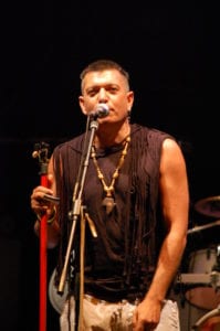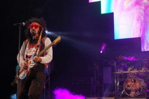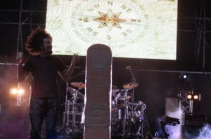 Le trasformazioni si susseguono repentine ed efficaci ed il pubblico balla alzando un polverone da terra (l’unica nota stonata di ieri sera visto l’assenza di pavimentazione sul campo); sull’ultima delle prime dieci canzoni Caparezza sfoggia un abbigliamento hippie ed imbraccia una chitarra parodizzando la figura di Jimi Hendrix che non è fine a sé. Anzi è un invito al pubblico a pensare a quale possa essere il messaggio, il tutto avvalorato dal trasformismo dell’autore dei testi. Un invito a riflettere, insomma. Non solo, parodizza anche sulla figura dei Beatles (vista la chitarra con la cassa raffigurante la bandiera inglese) e sul fenomeno creato. Una generazione sospesa tra un’illusione e una dimenticanza. Ed il gioco riesce davvero bene.