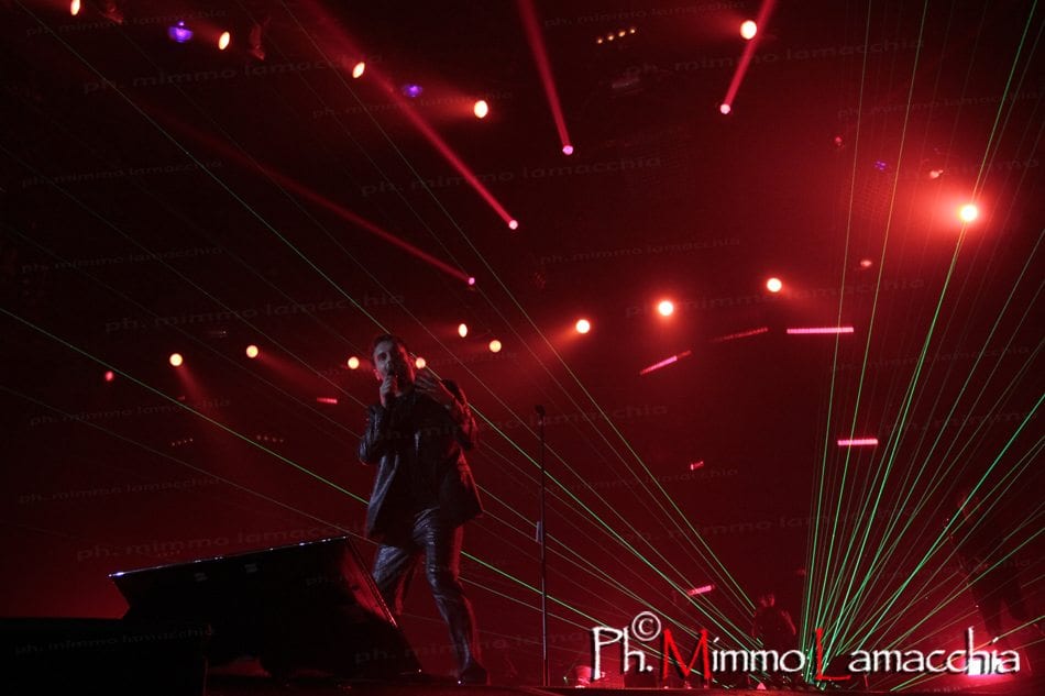 Il palazzetto è un colpo d’occhio eccezionale, pienissimo con i fan in trepida attesa, pronti a cantare e a ballare, ma anche a tifare per la squadra del Bologna calcio, con cori a favore del neo presidente Joè Tacopina, presente in tribuna e grande ammiratore del cantante.