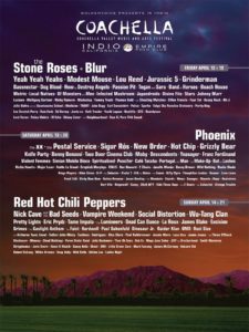Nel deserto dell’Indio ogni anno è davvero esclusivo il programma di esibizioni e presenze vip che in occasione della mondanità musicale del Coachella sfilano in nome della musica (e non solo). Il programma di quest’anno è davvero tra i più ricchi degli ultimi anni: i Blur sono annunciati come headliners, come da promessa Trent Reznor e i sui How To Destroy Angels si esibiranno durante la prima giornata, gli Yeah Yeah Yeah’s tornano dopo un po’ di silenzio ad esibirsi dal vivo, si riuniscono i The Postal Service, ci sarà Moby, Nick Cave and The Band Seeds, Stone Roses, i Vampire Weekend e tantissimi altri nomi, i quali chi per un ritorno, chi per un’uscita discografica, approfittano del palco più famoso del mondo per esaltarsi con la folla amante dei live. I Rolling Stones sembrano non comparire tra i nomi del Coachella, contrariamente a quanto annunciato, probabilmente per mancanza di tempo: reduci dai live che celebravano la carriera musicale cominciata ben cinquant’anni fa, non avranno avuto modo di organizzarsi per le esibizioni live al Coachella, così da rimandare almeno per ora il festival, in modo da organizzarsi per altre date live previste per quest’estate.