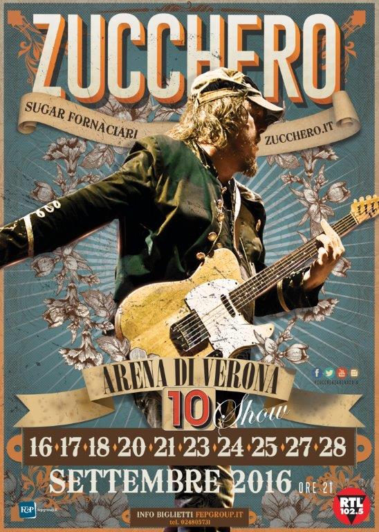 Quelli del 16, 17, 18, 20, 21, 23, 24, 25, 27 e 28 settembre saranno gli unici concerti di Zucchero in Italia per tutto il 2016 e segneranno la prima tappa di un tour che impegnerà l’artista in tutto il mondo. Nelle 10 serate in programma Zucchero porterà in scena uno spettacolo unico con la partecipazione di un ospite speciale per ogni appuntamento, regalando così al pubblico la possibilità di vivere un’esperienza inedita e irripetibile.