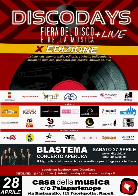 Il primo appuntamento, introduttivo la kermesse, è previsto il prossimo Sabato 27 Aprile 2013 con il live dei Blastema (per la prima volta a Napoli) spalleggiati dai The Trick, gruppo partenopeo che presenterà per l’occasione il proprio CD di esordio. Si potranno ammirare, inoltre, le opere di numerosi artisti in preview esclusiva alla decime edizione DiscoDays dal titolo “The Icons – i volti della musica” nata da un’idea di Nello Arionte, realizzata in collaborazione con PromuoivamoArte nonchè presentazioni e showcase così come da calendario primaverile e la presentazione in esclusiva nazionale della rivista di collezionismo Raro Più. E ancora mostre fotografiche, proiezione di filmati, consegna di premi e quant’altro concerno il rapporto tra il pubblico e l’universo musica.