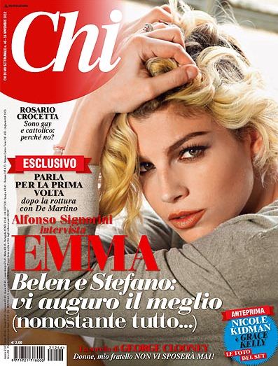 La cantante, inoltre, presto inizierà il nuovo tour e lei stessa spiega che non è proprio capace di stare ferma. Emma si definisce piena di idee, desiderosa di nuove sfide e spiega che le piacerebbe che uno suo concerto sia definito un’esperienza emozionale. La cantante salentina conclude dicendo che oltre alla parte rock ben visibile si sta impegnando per tirare fuori anche quella più intimistica, un percorso difficile ma che ha come scopo quello di soddisfare totalmente i fan: “Voglio che il mio pubblico sia contento dei 30 euro che spende per venire a vedermi”. L’intervista integrale ad Emma svolta da Alfonso Signorini si trova su Chi di questa settimana. Ricordiamo che il tour di Emma inizierà l’11 Novembre dal Polo fieristico di Morbegno, toccherà Milano, Padova, Eboli, Napoli, Roma, Pesaro, Firenze, Torino, Bologna per concludersi a Genova.