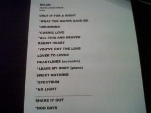 Un Mediolanum Forum silenzioso e allo stesso tempo rumoroso, tutti accorsi a vedere questa creatura davvero molto particolare. Encore come previsto con “Shake It Out” e “Dog Days Are Over”, l’urlo di saluto straziante di Florence and the Machine. In definitiva il concerto strappa una valutazione assolutamente positiva. Seppur vedendo i video o guardando gli spettacoli di Florence and the Machine sia evidente questa aurea che aleggia del tutto mistica e ultraterrena, seppur non è una novità che Florence saltelli e corra per tutto lo show, dal vivo è proprio qualcosa di diverso. Ancora una volta il potere della musica live è intoccabile e le emozioni regalate da Florence e soci, qualche ora fa, sono state forti e stupefacenti.