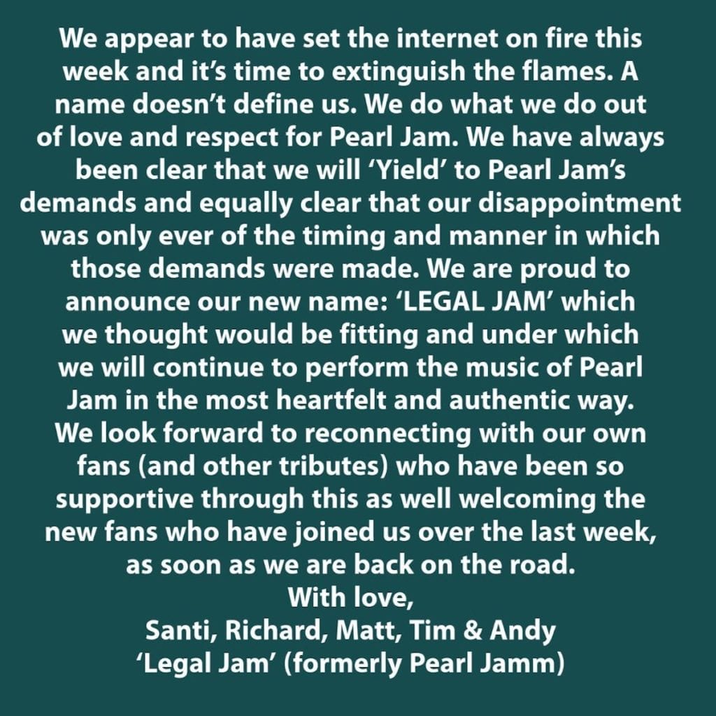 Si chiamavano Pearl Jamm, ma adesso si chiamano Legal Jam. La tribute band, dopo aver sollevato un polverone sul cambio di nome “forzato” a seguito della diffida, ha fatto un passo indietro e ha annunciato quello nuovo. I Pearl Jam, quelli veri, infatti, sono passati alle vie legali richiedendo il cambio di nome per una band nata proprio dal grande amore per la musica di Eddie Vedder. Troppo simile, tuttavia, a quello della band originaria, che generava non poca confusione. A questo si aggiunge il fatto che anche il merchandising fosse praticamente identico a quello del gruppo di Seattle. I PJ veri, con una sola M, hanno avuto la meglio e nonostante gli attuali Legal Jam si fossero mostrati poco propensi al cambiamento, hanno dovuto accettare.