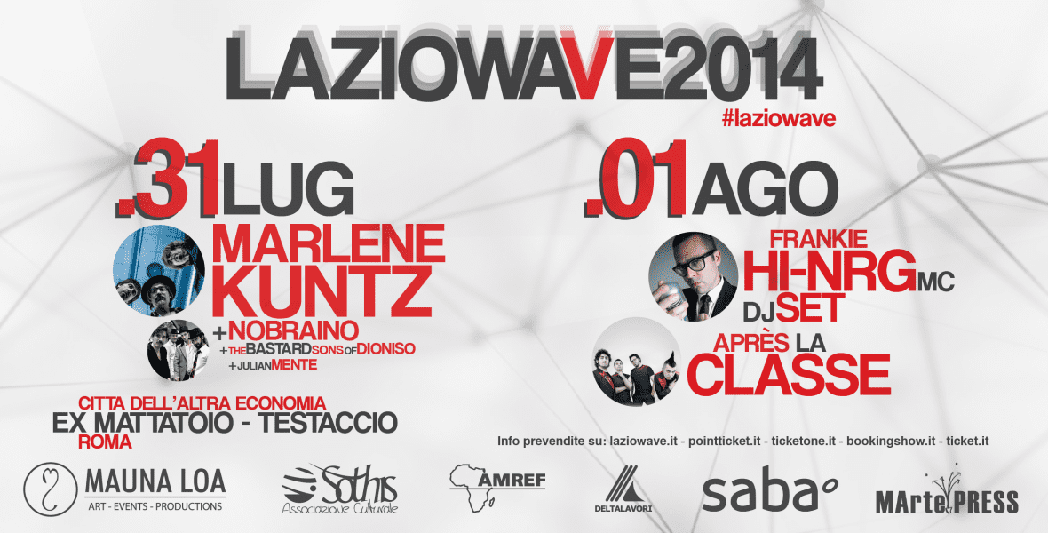 Giunto alla sua 6° edizione, quest’anno il Laziowave si svolgerà a Roma, presso la Città dell’Altra Economia a Campo Boario, all’interno del Festival estivo “Eutropia” che iniziato il 6 giugno, terminerà il 14 settembre, coinvolgendo band di prestigio. Il Laziowave Festival darà il via a due giornate all’insegna del ritmo che vedranno le performance di artisti della musica alternative. Il 31 luglio saranno i Marlene Kuntz i protagonisti della serata che presenteranno il nuovo album “Nella tua luce”. A loro si affiancheranno i Nobraino, i The Bastard Sons of Dionisio e la band di Foligno dal rock alternative Julian Mente.