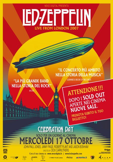 Lo show, a distanza di (quasi) cinque anni, arriva anche sui grandi schermi e il 17 Ottobre, data unica, il concerto verrà proiettato in contemporanea mondiale in alta definizione. L’intero spettacolo e la conversione in film è stata curata da vicino dagli stessi Led Zeppelin. Presentato come “Live from London 2007, il concerto inedito più richiesto nella storia della musica”, ecco che lo show vanterà la seguente scaletta: