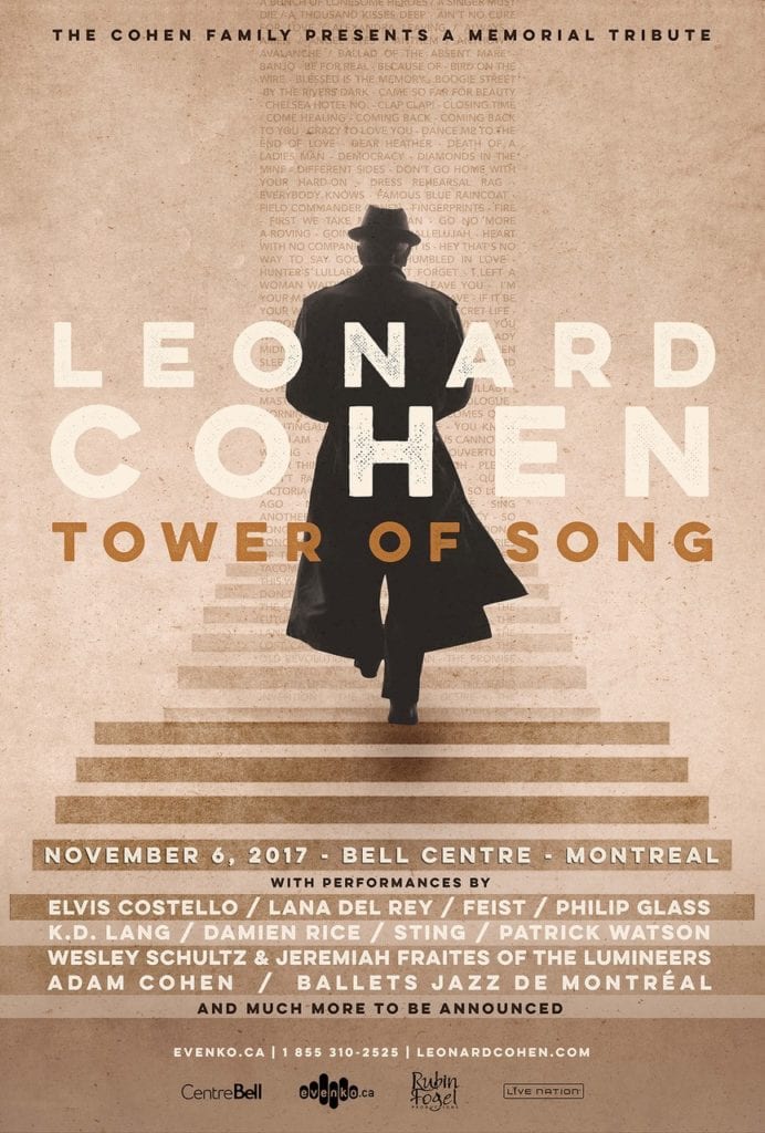“Tower Of Song” è il primo evento che celebra Leonard Cohen nell’anniversario della sua morte, avvenuta il 7 novembre del 2016, ma per tutta la settimana ci saranno diversi eventi a Montreal. Tra questi la mostra al Musée d’art contemporain che ne celebra la vita e il lavoro e che è stata approvata dallo stesso cantautore poco prima di morire, “Leonard Cohen: Une brèche en toute chose / A Crack in Everything“, che aprirà al pubblico il 9 novembre.