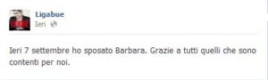 Anche per questo motivo, per la totale riservatezza ed autoprotezione della propria privacy, la notizia del matrimonio con la compagna Barbara Pozzo, sua ex fisioterapista, ha fatto il giro della rete in pochi minuti. Lo stesso Ligabue ha tenuto ad informare i propri fan della notizia con un post dal carattere quasi telegrafico nella propria pagina ufficiale di Facebook.