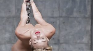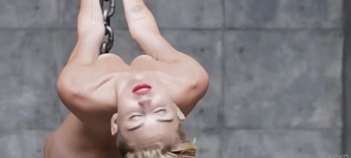 Nel video di “Wrecking Ball”, infatti, Miley Cyrus si mostra inizialmente vestita di bianco con abbinamento top corto-slip, versione candida della Jennifer Lopez di “I’m Glad”, ma appena poche scene dopo la ritroviamo completamente nuda aggrappata ad una catena a cavallo di una palla demolitrice (esattamente la “wrecking ball” cui si accenna nella canzone, immagine con cui la cantante raffigura l’uomo che ama e la fa soffrire).