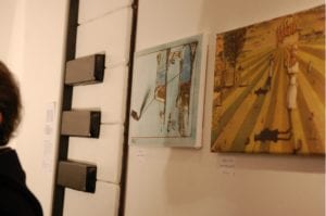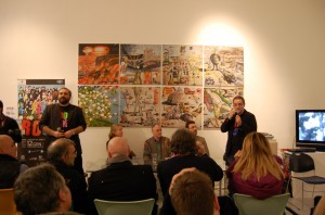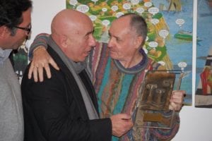 Interviste e foto di rito come da consuetudine, la parola a Carmine Aymone che fa spalla con Michelangelo Iossa: presentazione ufficiale, ringraziamenti e partecipazioni, intervento del giornalista Donato Zoppo, consegna del premio ‘Rock Legends‘, domande dei presenti, firma-copia; questa la scaletta. Divertito (a tratti incredulo) per l’affluenza di persone che ieri hanno preso d’assalto le sale al primo piano del PAN, Paul Whitehead racconta le creazione che hanno segnato album destinati a diventare immortali: per i Genesis le 3 copertine (tra l’altro in esposizione) sono “Trespass”, “Nursery Crime” e “Foxtrot”; curioso l’aneddoto circa la copertina di “Trespass”: entrato in contatto con i Genesis alla mera età di 23 anni, Peter Gabriel rovesciò completamente i contenuti dell’album, rendendoli più forti, dunque la copertina non era più adatta per l’occasione: aveva bisogno di qualcosa di più “cattivo”. Una discussione tra i due portò Peter Gabriel ad afferrare un coltello effettuando un’incisione su tutta la tela, in trasversale: quel coltello fu ripreso da Paul Whitehead di sana pianta, ed ecco la copertina di “Trespass” dai contenuti più strong rispetto quelli preventivati. Anche i Vand Der Graaf Generator non passano di certo in secondo piano: l’autore analizza la copertina di “Pawn Hearts” con il giornalista Donato Zoppo in questo gioco di contrapposizioni tra due mondi completamente differenti (Genesis e VDGG) ma con un massimo comun divisore.