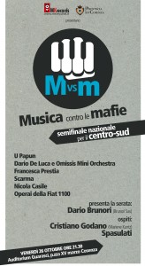 I semifinalisti si esibiranno in una speciale serata di “Musica contro le mafie”, venerdi 26 Ottobre 2012 a Cosenza presso l’Auditorium Guarasci in piazza XV Marzo, con inizio alle ore 21:30 . La serata sarà presentata da Dario Brunori della Brunori Sas, artista co-autore, insieme ad altri 50 artisti, del libro/cd in uscita: una veste inedita per il cantautore dandy che per vicinanza e condivisione del progetto, condurrà l’evento.