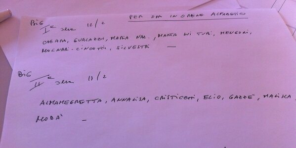 Una notizia arrivata pochissimi minuti fa, ma che ha già fatto il giro della rete: è bastata una semplice foto postata su Twitter per scatenare l’inferno mediatico (ma stavolta tutto positivo) sul Festival di Sanremo 2013. Finalmente sappiamo chi saranno i Big che si esibiranno nella serata di apertura della kermesse di martedì 12 Febbraio e quali invece avranno modo di cantare la sera successiva, mercoledì 13 Febbraio. Sono stati divisi in due gruppi di 7 e tutti eseguiranno entrambe le canzoni in gara una di seguito all’altra, per consentire al pubblico da casa ed alla Giuria della Stampa di realizzare un confronto più equo e decidere quale proseguirà la propria corsa alla vittoria.