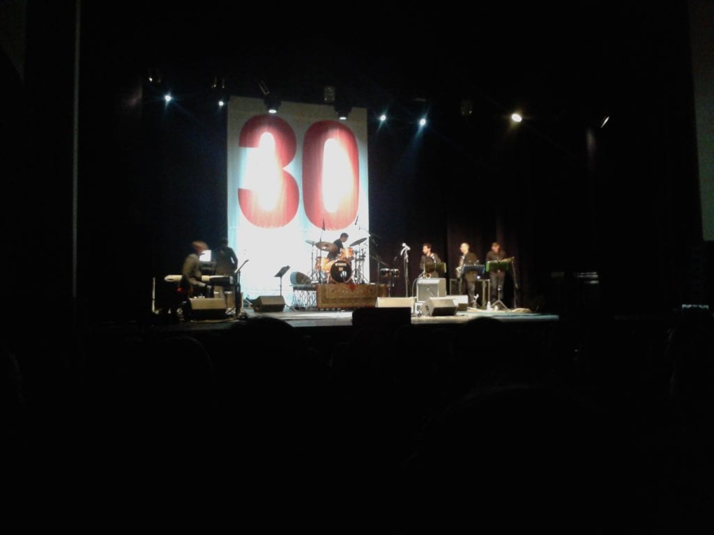 La platea è quasi del tutto gremita quando si presenta sul palco la band al completo: pianoforte e tastiere, basso, batteria e sezione fiati (sassofono, tromba e sax) in attesa della guest star della serata e della sua chitarra. Tranne un enorme striscione sullo sfondo con il numero “30”, la sceneggiatura è scarna ed è lasciato ampio spazio agli strumentisti ed al cantante di muoversi ed interagire col pubblico.