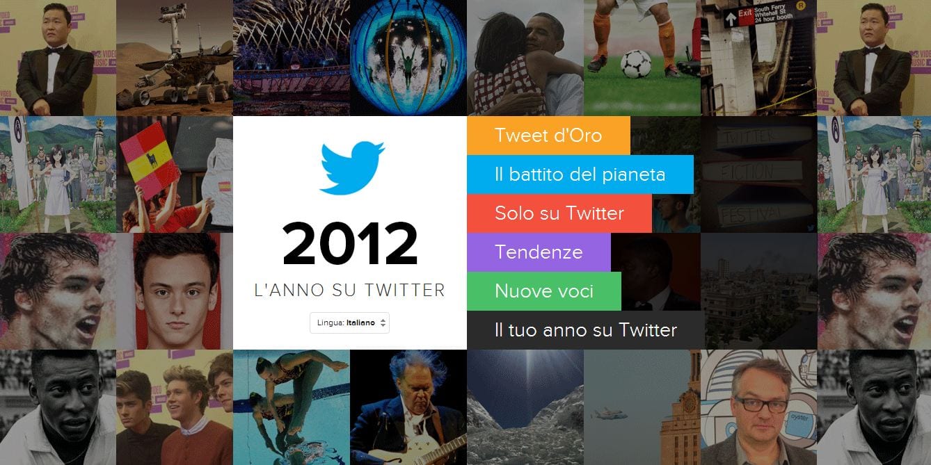 Twitter ha recentemente pubblicato una sezione dedicata alle statistiche del 2012 e ai fatti accaduti nel corso dell’anno. Definire Twitter non è mai facile, social network non è totalmente corretto, semplice sito neanche. Definizioni vogliono che Twitter sia visto come un ibrido fra social network e microblogging. Di certo, oltre alle definizioni possibili e plausibili, l’uso di Twitter è sempre più diventato indispensabile nella vita delle star, dei volti noti, degli artisti ma non solo. Nato nel 2006 dalla mente di Jack Dorsey ormai Twitter è diventato il mezzo di diffusione delle notizie, il tutto in 140 caratteri. “L’anno su Twitter” ripercorre quindi il 2012 e, come vedremo di seguito, i temi toccati sono moltissimi. Ormai ci stiamo avviando alla fine dell’anno e il momento delle classifiche è arrivato.
