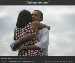 Il Tweet d’Oro va al presidente Barack Obama e l’abbraccio con la moglie Michelle Obama. La foto ha fatto il giro del mondo (e di Twitter) conquistandosi la palma d’oro virtuale del Tweet d’anno: “Four more years”, più foto aggiuntiva, ha visto un numero di retweet pari a 810,000+. Il tweet di maggior successo nella storia di Twitter visto che esso è diventato contemporaneamente il più ritwittato del 2012 ma anche il più ritwittato di sempre. Un successo per Obama e moglie davvero enorme. Il tweet recava la data del 7 Novembre 2012, un tweet storico per Obama, un tweet storico per gli USA ma soprattutto un tweet storico per Twitter.