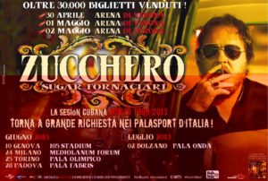 Zucchero si appresta a dare il via al suo “La sesion cubana” World Tour 2013 che partirà dalla Polinesia francese il 5 Aprile 2013 e toccherà moltissimi stati prima di approdare in Italia, dall’Australia passando per l’Italia (Arena di Verona), Svizzera, Austria, Francia, Germania, Belgio e moltissime altre nazioni. Oltre alle date all’Arena di Verona, Zucchero si esibirà a metà giugno a Genova, Milano, Torino, Padova e Bolzano. Zucchero ha fatto il tutto esaurito all’Arena di Verona per ben tre date che saranno il 30 Aprile, 1 Maggio e 2 Maggio. “La sesion cubana” è il ventiduesimo album di Zucchero Fornaciari ed è stato pubblicato il 20 Novembre 2012. Il disco, come abbiamo avuto modo di sottolineare già precedentemente, è stato interamente registrato a Cuba nel 2012 e vanta la collaborazione di numerosi artisti.