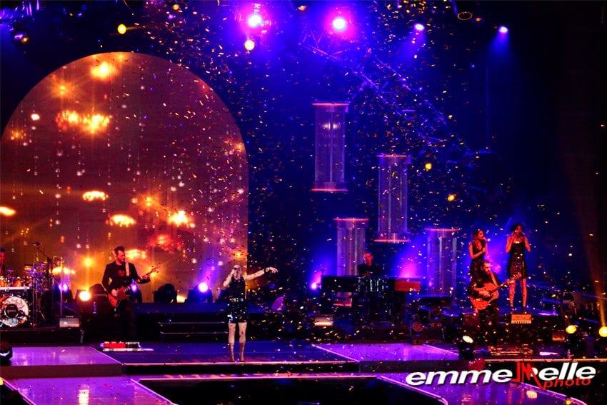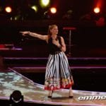 Sul palco si muove con naturalezza e disinvoltura, tra una canzone e l’altra, e un cambio di vestito, passa da brani melodici a pezzi ritmati con una performance vocale straordinaria, improvvisando anche passi di danza e movenze accattivanti.