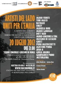 La serata evento, con il Patrocinio della Regione Lazio e del Comune di Genzano di Roma, vedrà protagonisti della musica e dello spettacolo insieme per raccogliere fondi per le popolazioni terremotate dell’Emilia. Molti gli artisti che hanno deciso di aderire all’iniziativa, si alterneranno sul palco infatti Mario Venuti, Toni Malco, Nathalie, Finley, Mariella Nava, Marco Garofalo, Marco Guazzone & Stag, Massimo Di Cataldo, Ghost, Piero Mazzocchetti, Agostino Penna, Avim-B, Giulia Anania, Gianfranco Phino, Vincenzo Capua, Misturafina.
