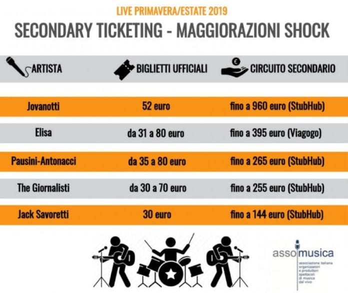 L’esposto presentato da Assomusica, nella sua veste di associazione di categoria, considera quali primari valori da proteggere sia il diritto dei consumatori a poter accedere nel massimo numero possibile agli eventi organizzati pagando il prezzo ufficiale fissato dallo stesso organizzatore sia il diritto degli artisti a non vedere alimentato attorno alla propria performance un mercato parallelo e opaco di compravendita di titoli di ingresso a prezzi spesso maggiorati di molte volte rispetto al prezzo ufficiale. Vengono segnalati alcuni esempi: per il tour “Jova Beach Party” di Jovanotti, a fronte di un biglietto con posto unico fissato a 52 euro per la data del 28 agosto a Lignano Sabbiadoro, su Viagogo si può arrivare a fino a 300 euro, cioè 6 volte in più (+500%). Per altre date (ad esempio 6 e 27 luglio 2019) su MyWayTicket si può arrivare a 402 euro ma su StubHub si toccano anche i 960 euro (+ 1750%). Situazione similare per il concerto di Elisa con i biglietti che su Viagogo toccano anche i 395 euro (+ 390%) e per il tour di Laura Pausini e Biagio Antonacci dove su StubHub i biglietti possono arrivare a 265 euro (+230%).