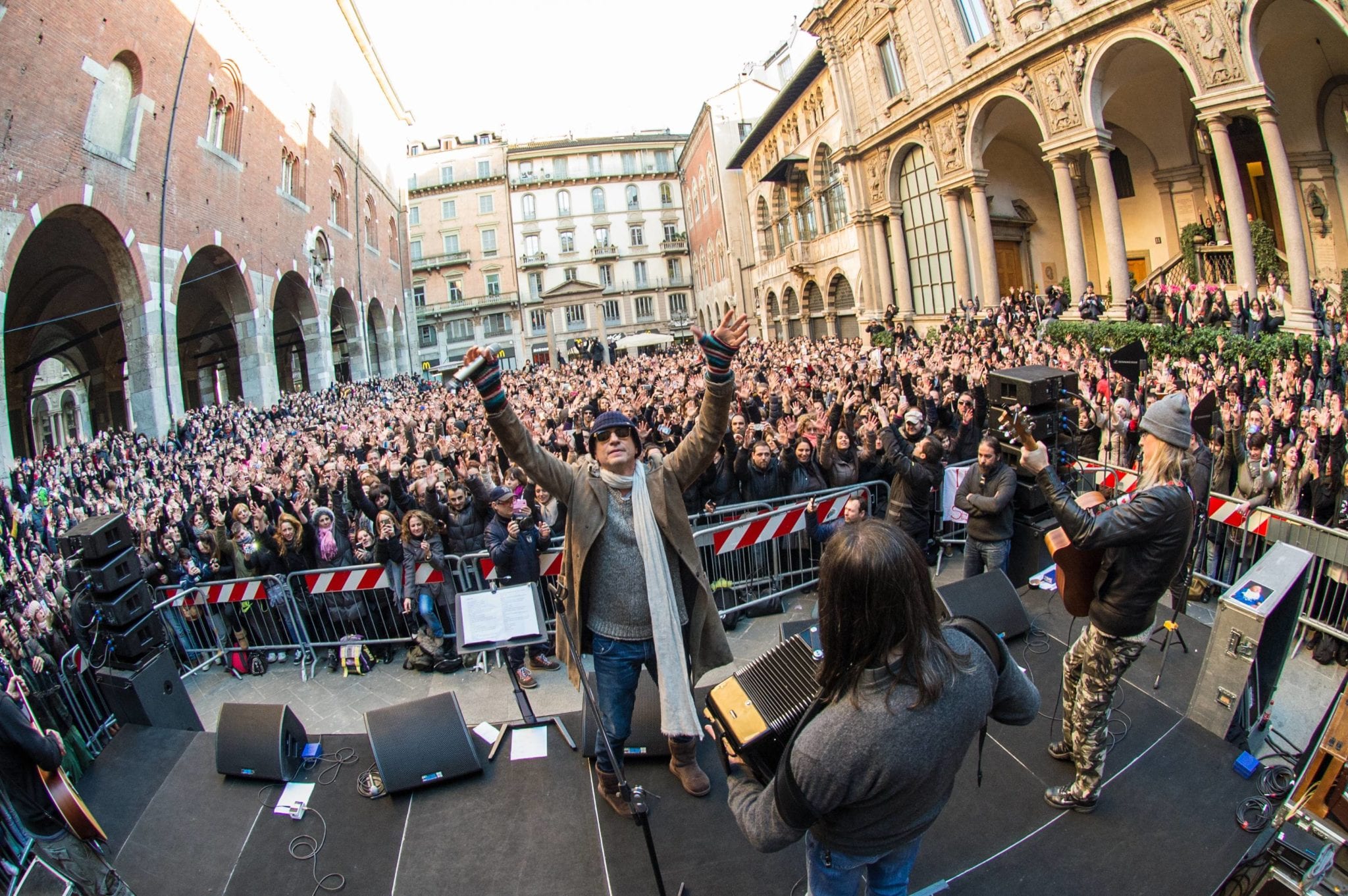 “Domani Sabato 25 Gennaio, ore 15.30, a Milano, all’aperto, in Piazza Mercanti, con pochi strumenti e pochi amici musicisti, farò musica… canterò “qualche mia canzone”….(…). Funziona solo se stiamo insieme!……..”
