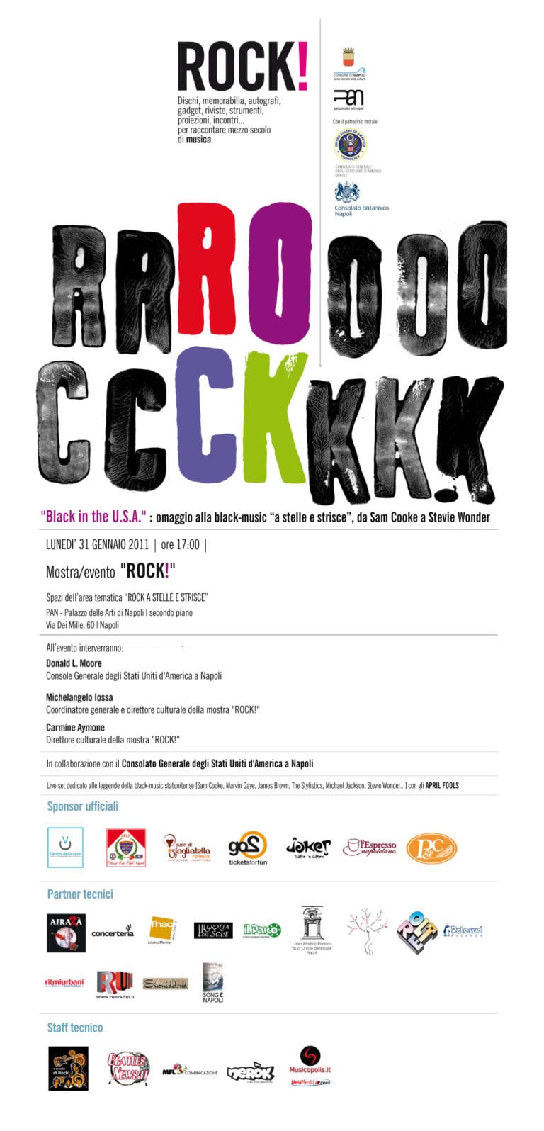 Presentata dal Comune di Napoli – Assessorato alla Cultura, la mostra ROCK! gode del Patrocinio del Consolato Generale degli Stati Uniti d’America a Napoli ,che ha contribuito alla realizzazione dell’area “American Dreams: il rock a stelle e strisce”, e del Consolato Britannico di Napoli.