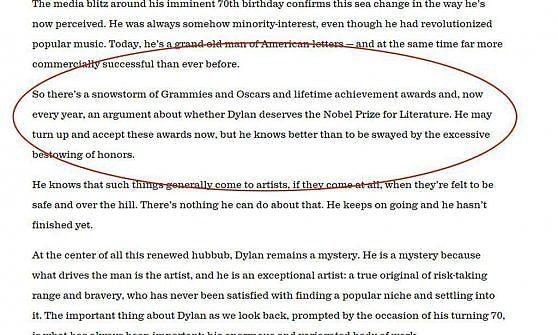 Nella sezione “Books” del suo sito che promuove un nuovo libro sui testi delle sue canzoni, “The lyrics: 1961-2012″, tra le credenziali della sua biografia era comparsa anche quella relativa al “Premio Nobel per la Letteratura”. Per quanto non abbia disposto alla Reale Accademia di Svezia, almeno sembrava aver recepito la notizia.