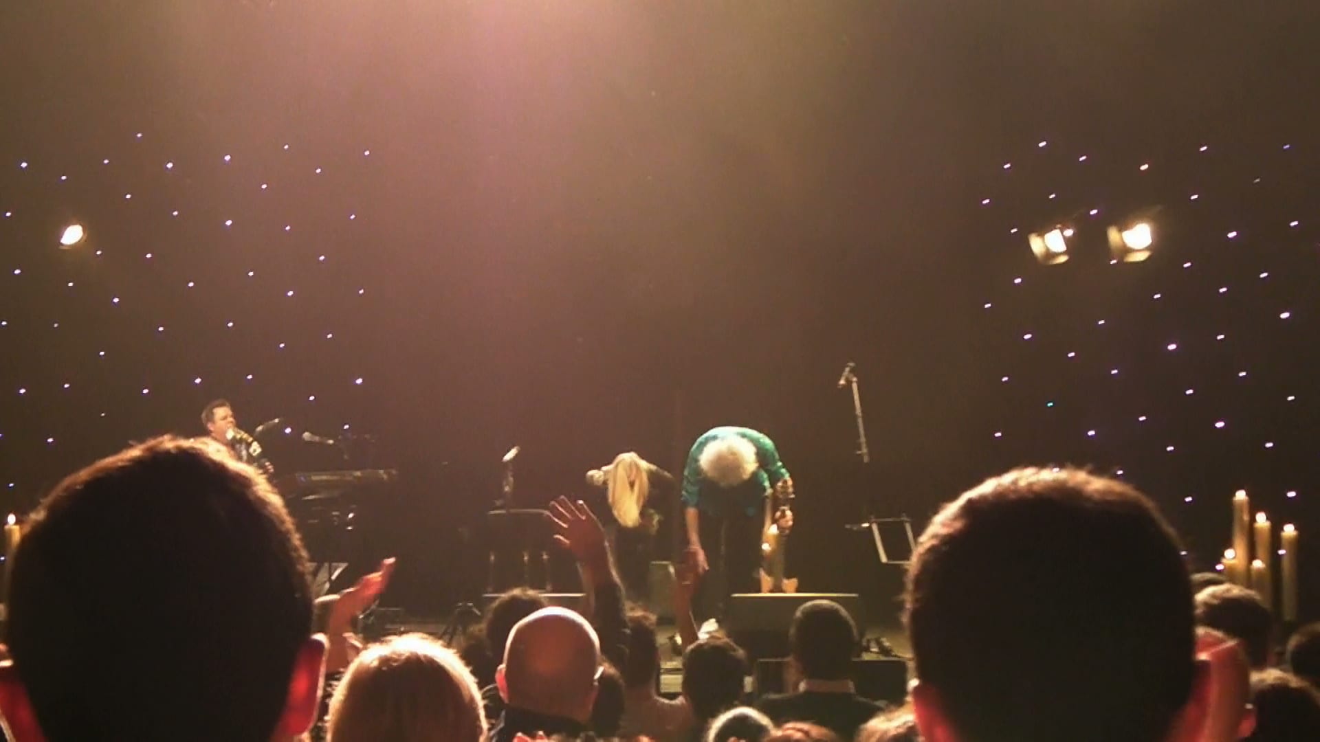 L’atmosfera al Teatro Arcimboldi di Milano è quella tipica di un concerto acustico, intima ed elegante. Due sgabelli, qualche candela e un fondale fatto di stelle, tutto qui. Non c’è l’attesa eccitata e la carica emotiva dei fans al concerto dei Queen con Adam Labert dell’anno scorso al Forum di Assago.