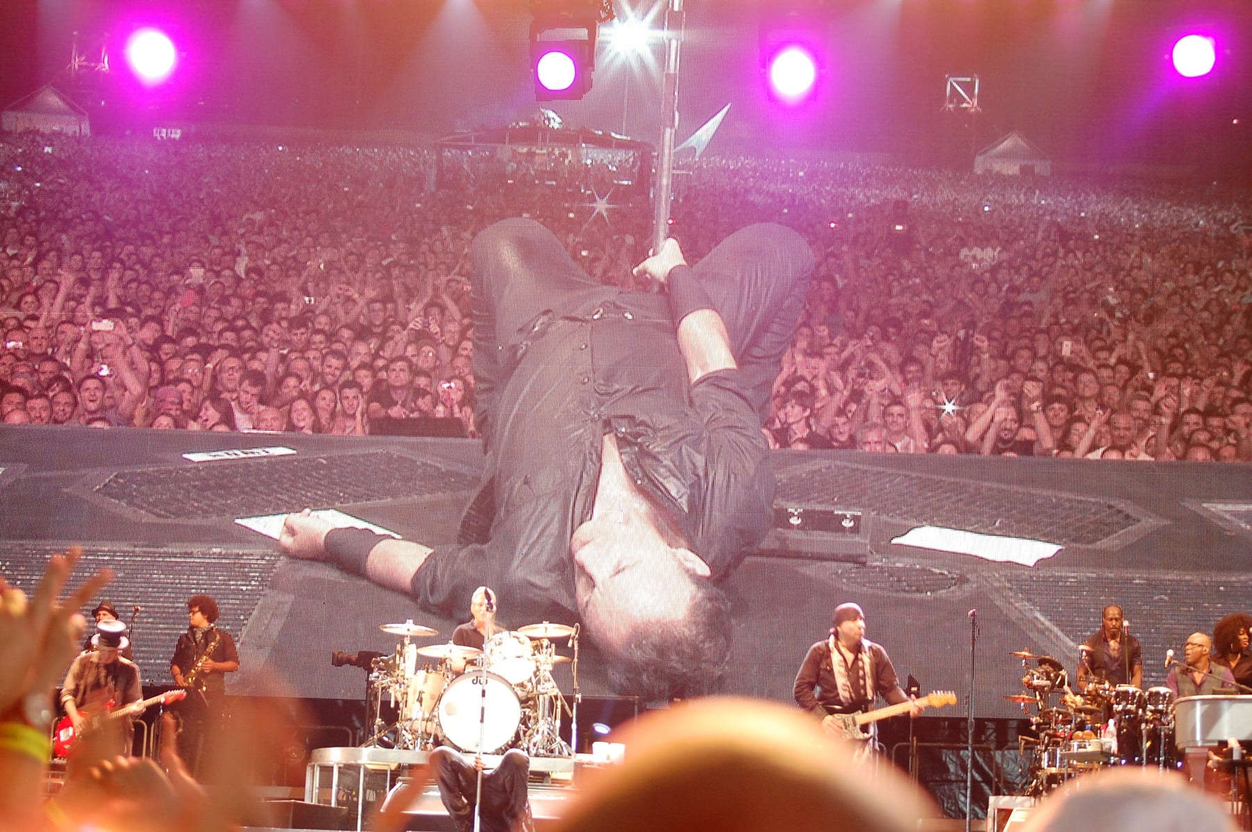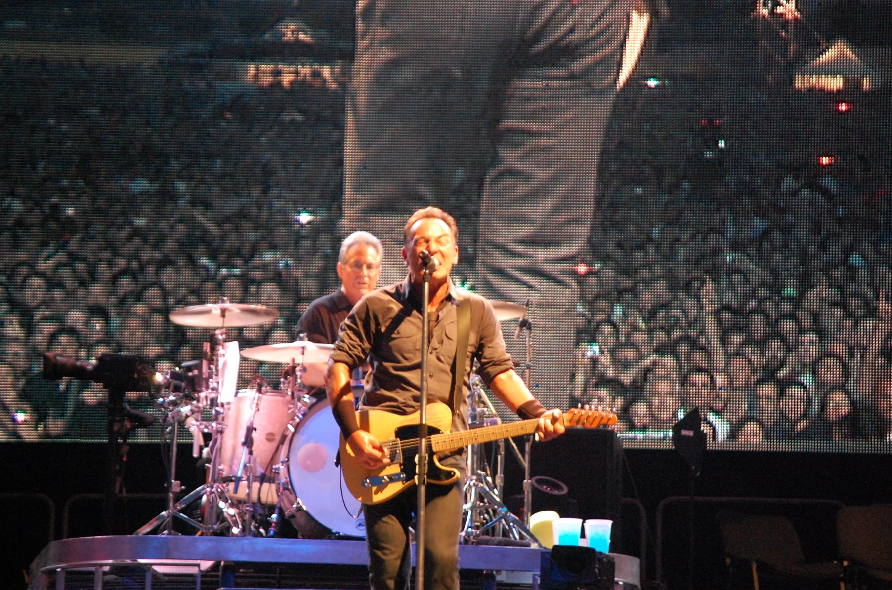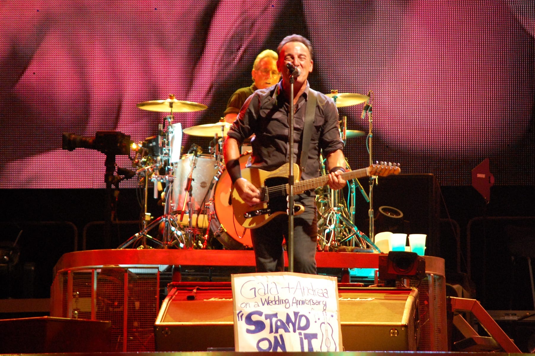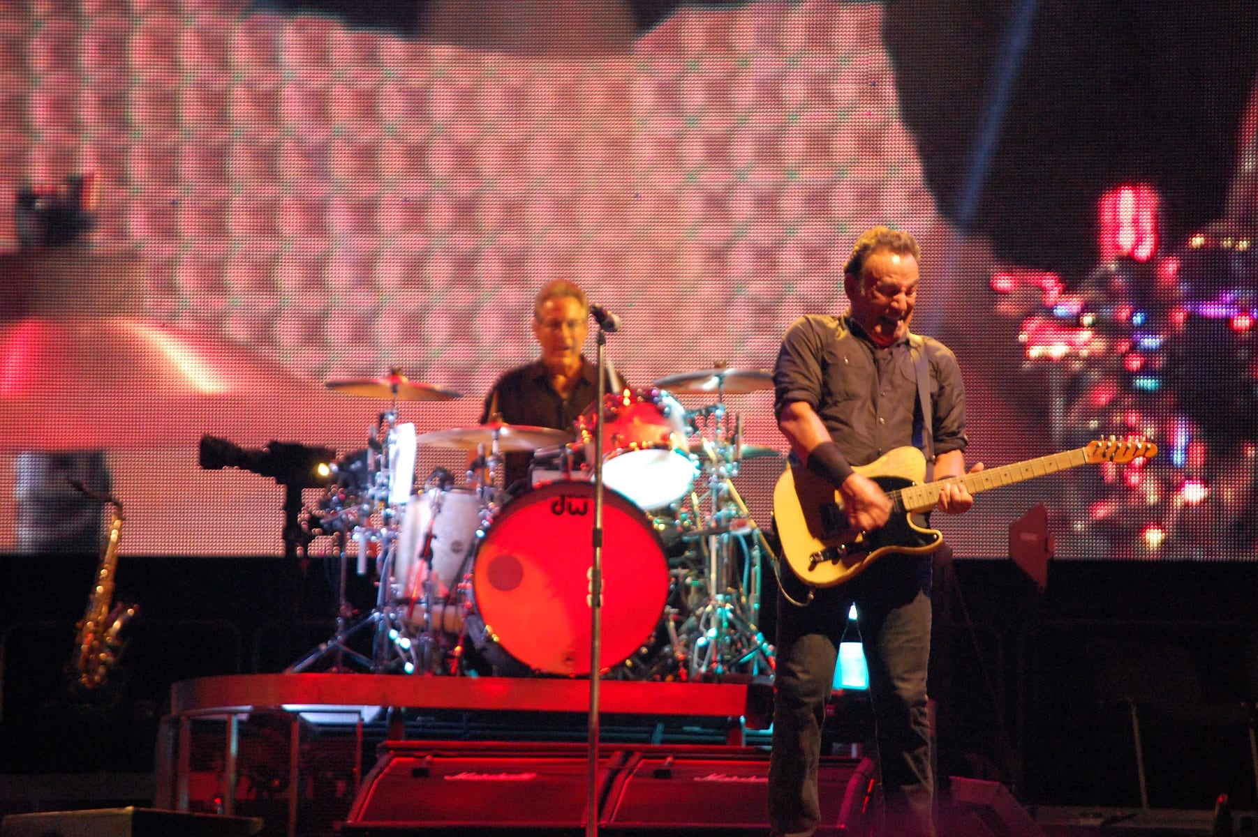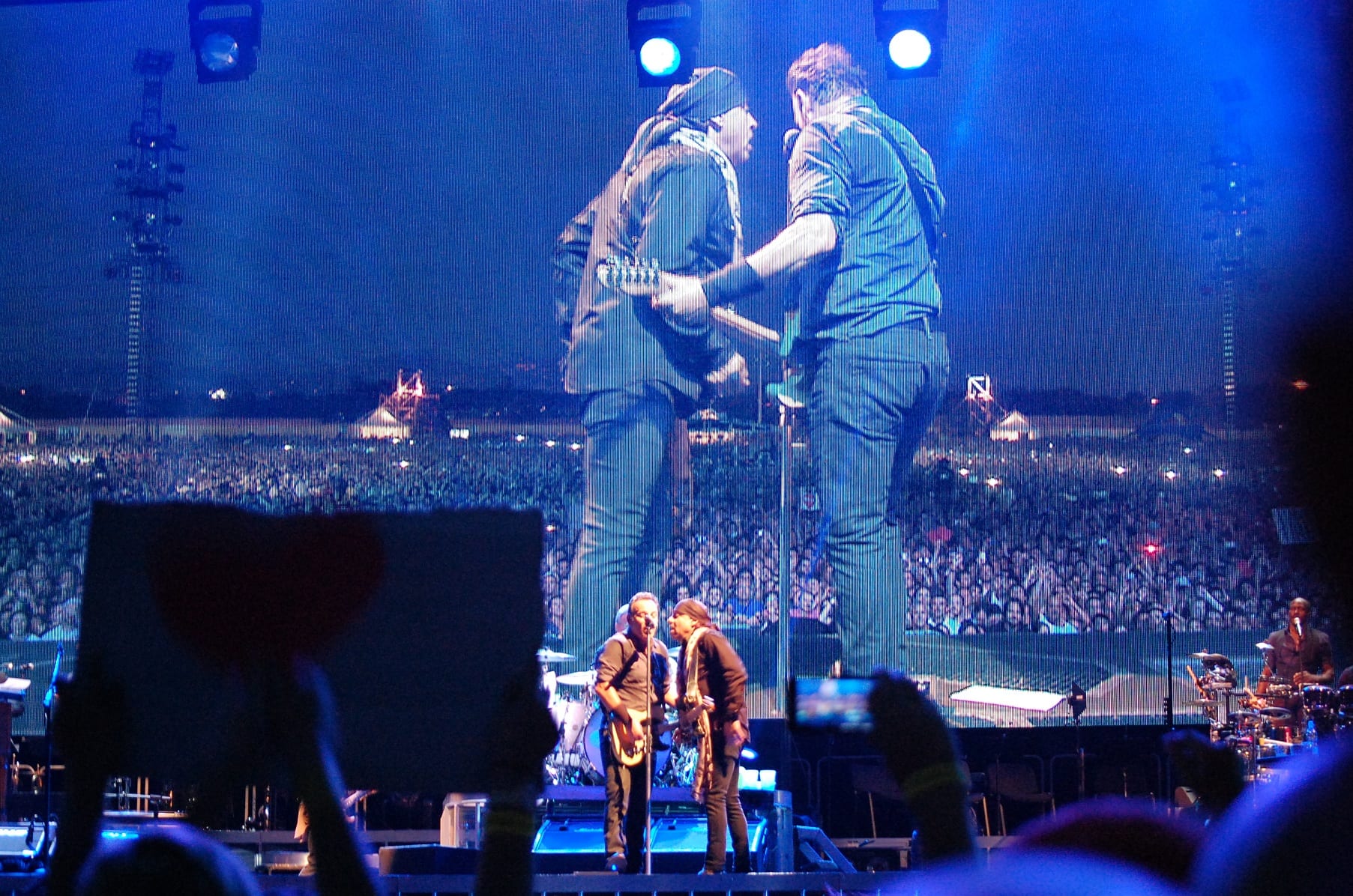 “Shackled and Drawn”, dove Bruce si cimenta in un balletto epico: prova a chiedere alle donne presenti quali emozioni ha suscitato quel balletto. “Darlington County”, “Bobby Jean”, “Waitin’ on a Sunny Day” (si rinnova la tradizione del bambino scelto tra il pubblico che stavolta singhiozza per l’emozione “Fantastico” Fantastico! Fantastico”), “The Rising”, “Land of Hope and Dreams” (“This is Land of Hope and Dreams” aprendo le braccia al pubblico). “Born in the USA”, “Born to Run”, “Dancing in the Dark” dove strappa una promessa di matrimonio a due ragazzi (su invito di lei): meglio di una benedizione! Si vede che è la serata delle spose, dal momento che sul palco salgono anche due promesse spose con tanto di velo. “Tenth Avenue Freeze-Out”, “Twist and Shout”, “Shout” (cover dei The Isley Brothers) dove si sbizzarrisce, sembra non volerla finire più. Saluta tutti, Jake Clemons e Danny Federici sono su quel palco con l’ausilio dei maxi-schermi “Roma Te Amo! Roma Te Amo! Roma Te Amo!”. Torna con la chitarra e l’armonica…e con “Thunder Road”.