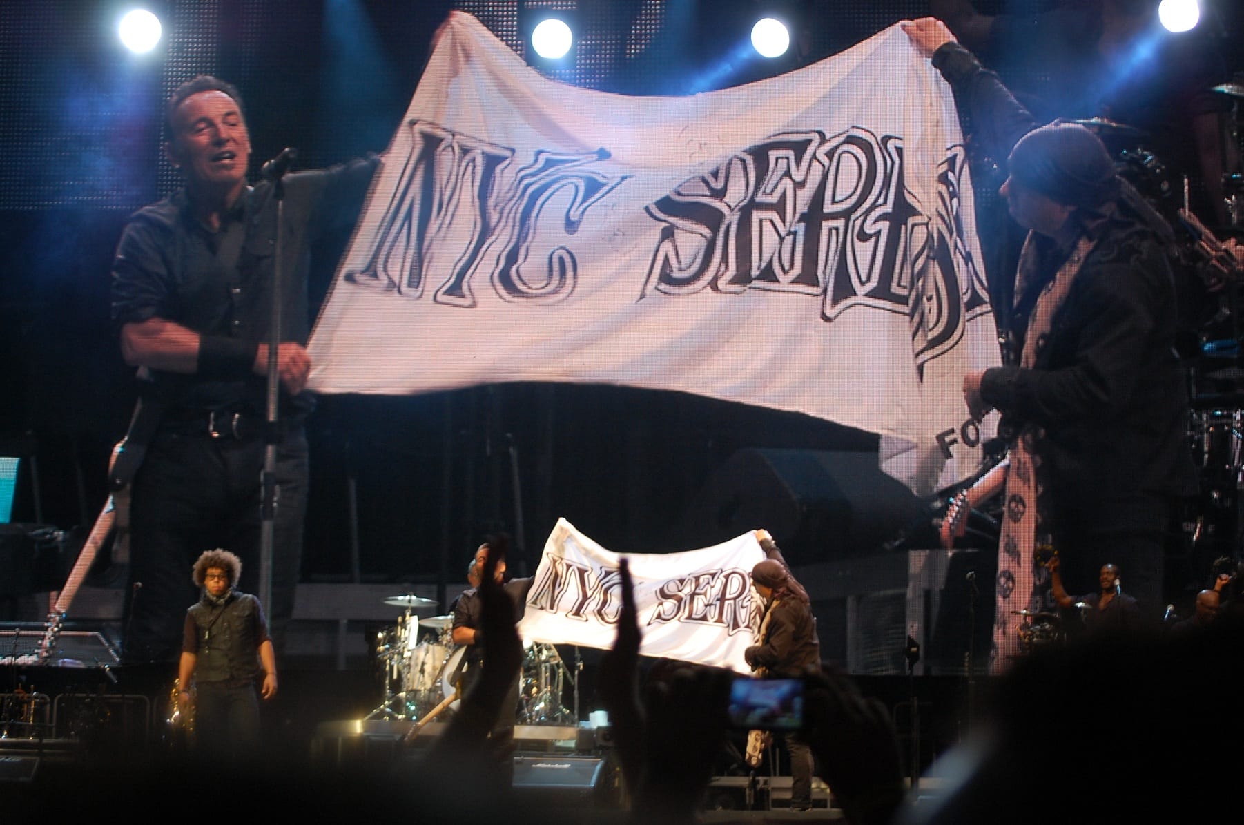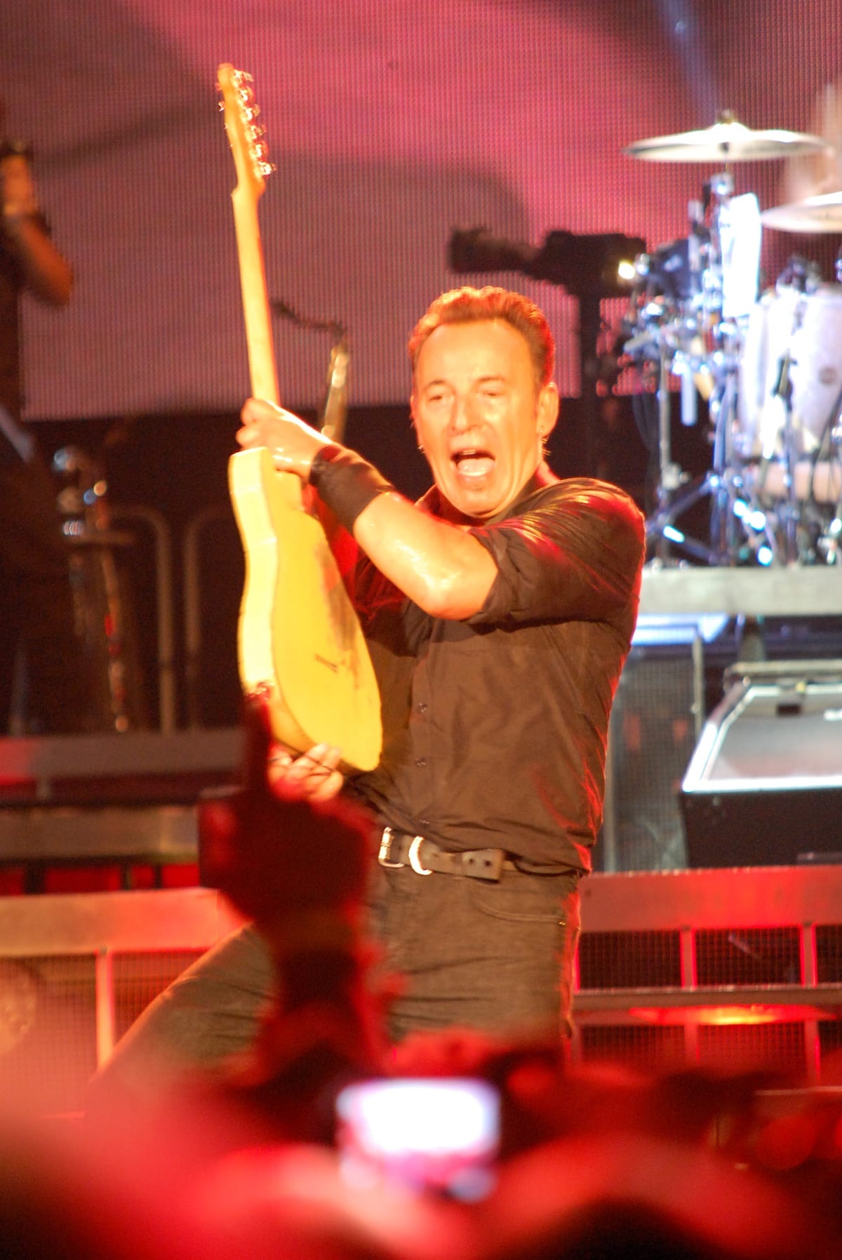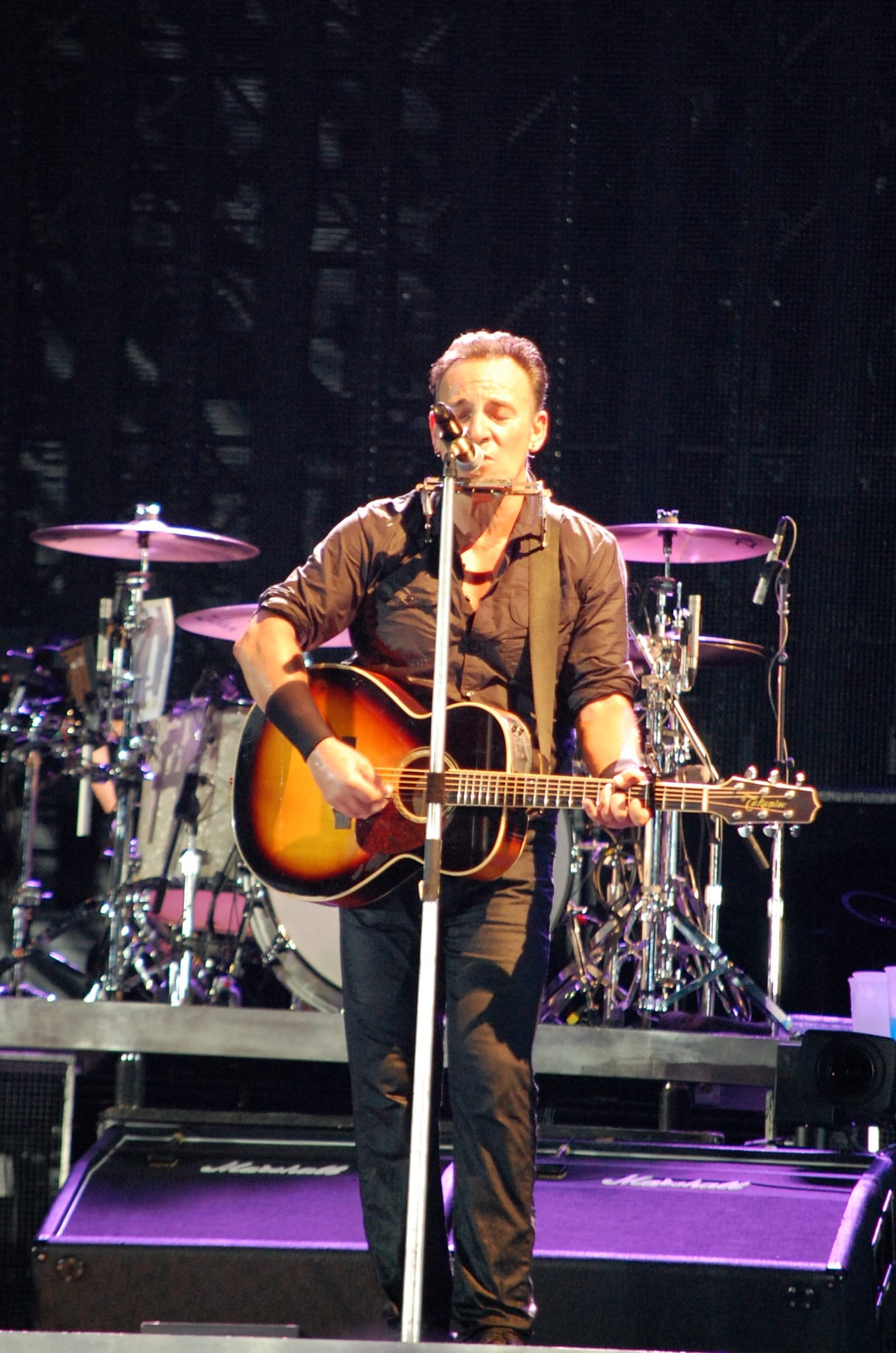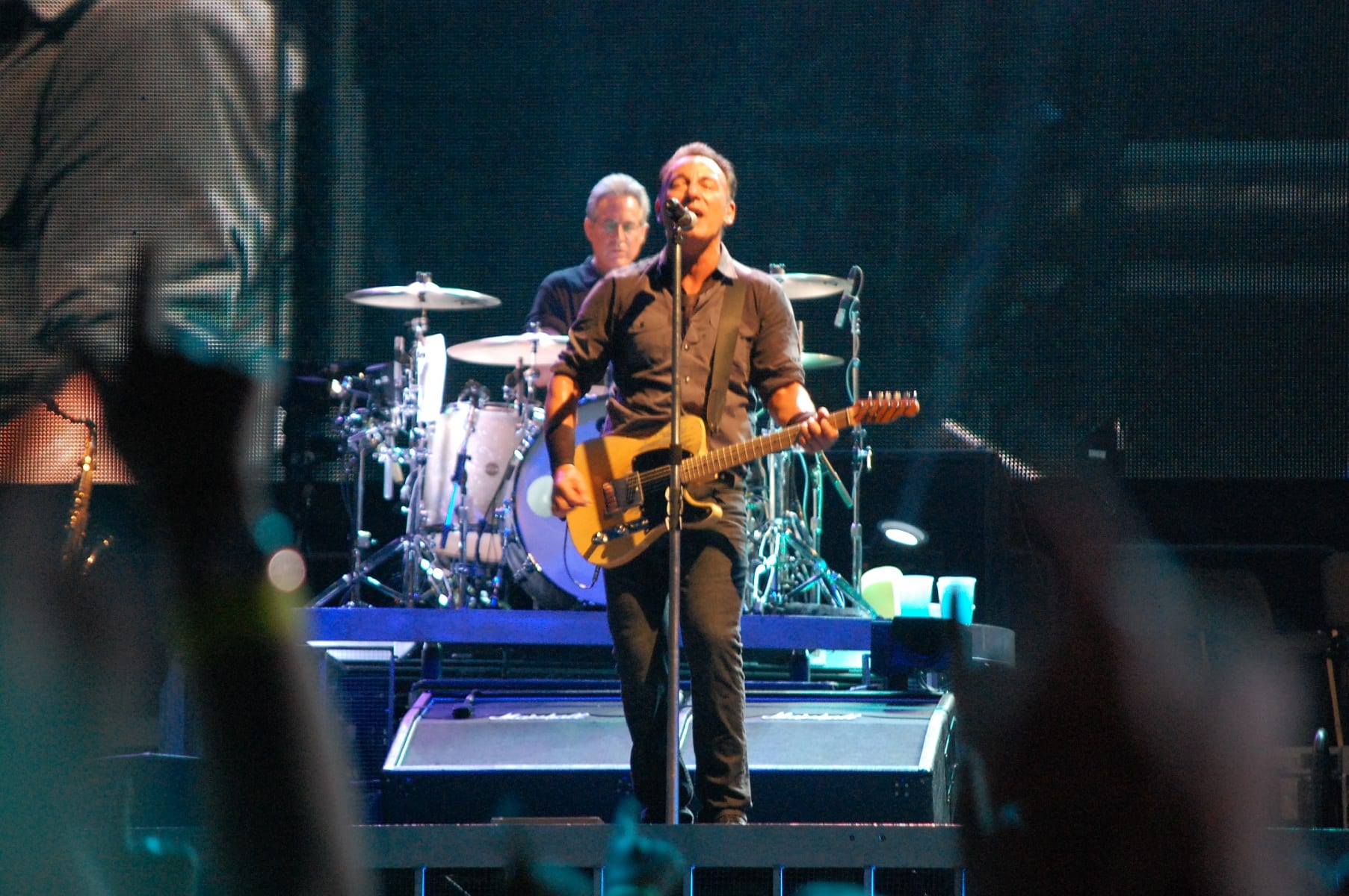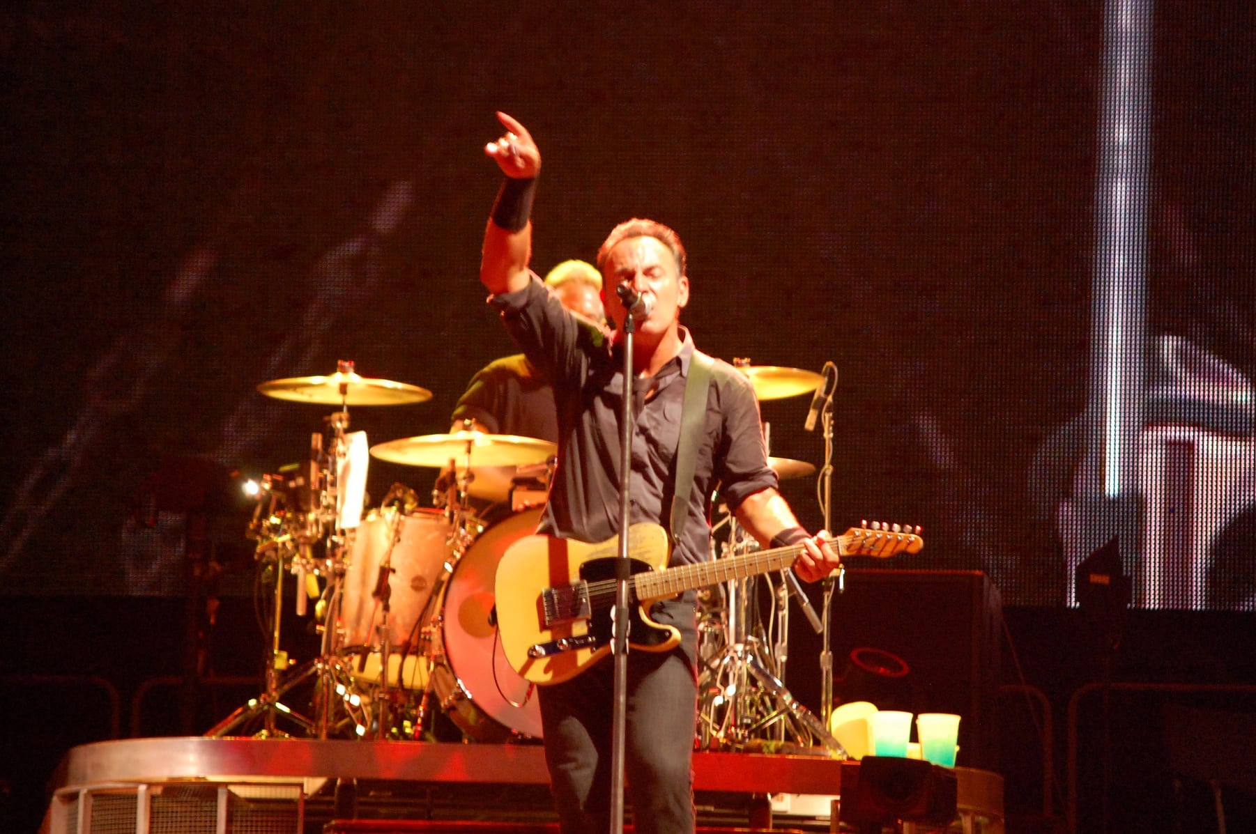 “Shackled and Drawn”, dove Bruce si cimenta in un balletto epico: prova a chiedere alle donne presenti quali emozioni ha suscitato quel balletto. “Darlington County”, “Bobby Jean”, “Waitin’ on a Sunny Day” (si rinnova la tradizione del bambino scelto tra il pubblico che stavolta singhiozza per l’emozione “Fantastico” Fantastico! Fantastico”), “The Rising”, “Land of Hope and Dreams” (“This is Land of Hope and Dreams” aprendo le braccia al pubblico). “Born in the USA”, “Born to Run”, “Dancing in the Dark” dove strappa una promessa di matrimonio a due ragazzi (su invito di lei): meglio di una benedizione! Si vede che è la serata delle spose, dal momento che sul palco salgono anche due promesse spose con tanto di velo. “Tenth Avenue Freeze-Out”, “Twist and Shout”, “Shout” (cover dei The Isley Brothers) dove si sbizzarrisce, sembra non volerla finire più. Saluta tutti, Jake Clemons e Danny Federici sono su quel palco con l’ausilio dei maxi-schermi “Roma Te Amo! Roma Te Amo! Roma Te Amo!”. Torna con la chitarra e l’armonica…e con “Thunder Road”.