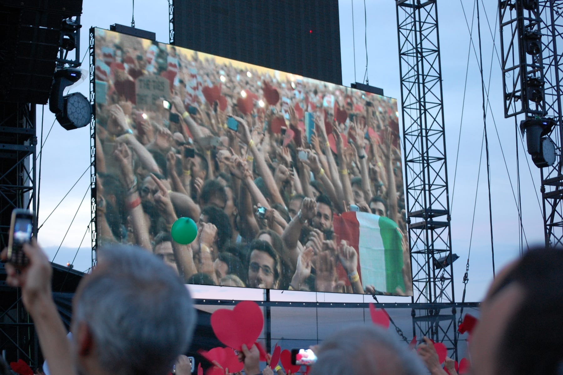 Bruce Springsteen & The E-Street Band. Di solito sono precisi anzi addirittura giocano d’anticipo tra sorprese, pre-show e tutto. E ora si fanno attendere che nel frattempo continuano a entrare le persone e ti chiedi quanto spazio c’è ancora disponibile. Perchè vedi il palco, ti giri attorno e vedi il pubblico che non sai dove e quando finisce, proprio come lo show, 3 ore e 35 minuti dalle 20:43 alle 00:18. Il Maestro (con la M) Ennio Morricone è presente stasera, mentre sul palco sale la E-Street Band ma tra cuori di carta, luci e maxi-schermi le anime rispondono “yeah yeah” quando una voce grida “Can You Feel the Spirit?”. I signori in maglia rosa ci dicono che (da sempre) solo 4 volte un concerto è cominciato sulle note e le parole di “Spirit in the Night”. E gli crediamo. Bruce sale sul palco e si lascia guidare dal pubblico, si butta a capofitto proprio!