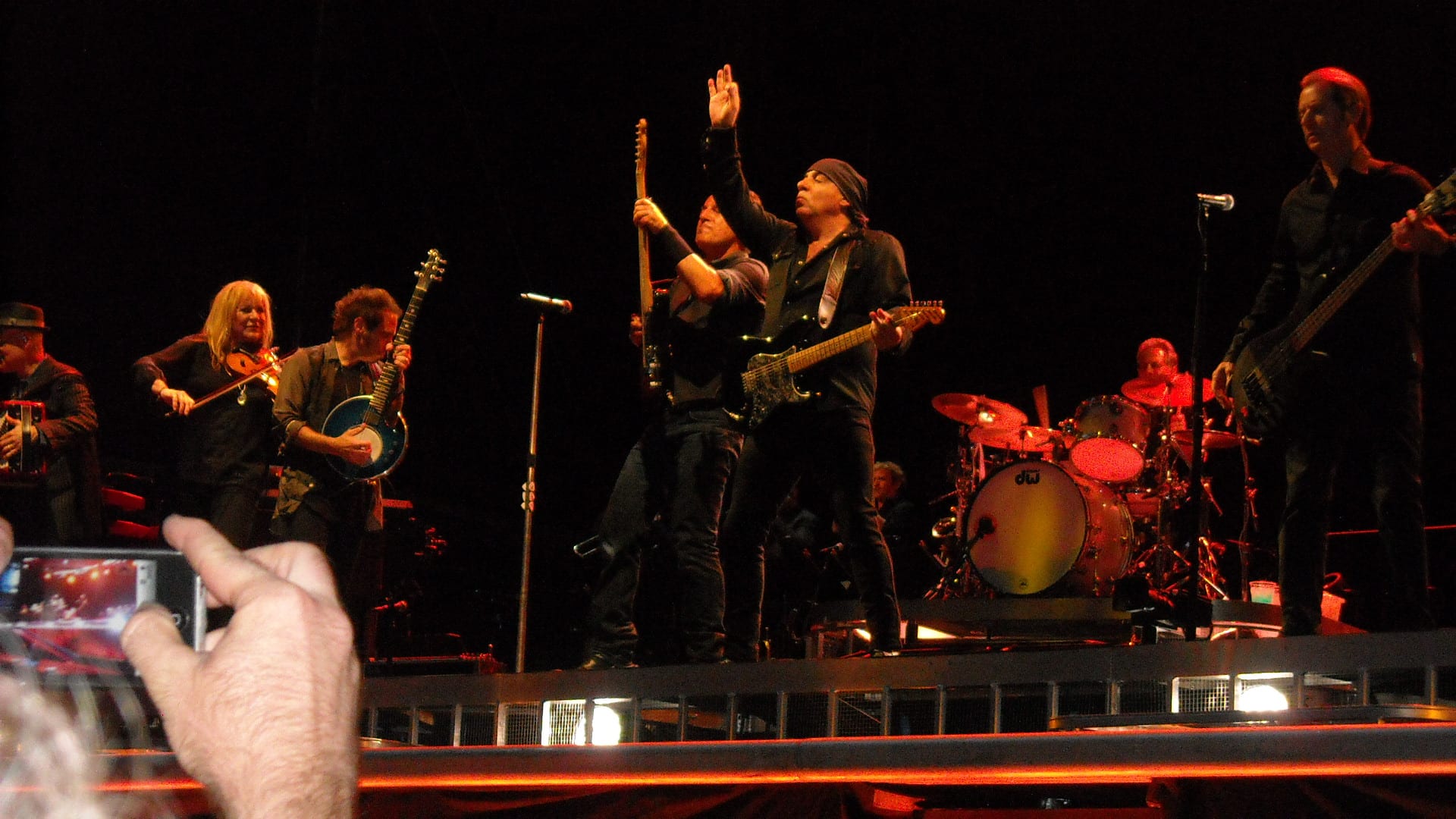 “Ciao Milanoooooooo…! Siete pronti?! Siete Pronti?! Siete Pronti?!”. Si Milano e l’Italia sono pronti ad esplodere, a cantare e ballare su una scaletta che conta 33 canzoni per 3h e 40 minuti di musica. Una guerra a suon di note. La rabbia, la forza, la palla da demolizione prende forma e comincia a distruggere tutto quello che di marcio c’è in questa realtà. Sospesi tutti tra una nota e la consapevolezza che davvero la musica può cambiare. “Wrecking Ball” è il secondo pezzo, di quelli sparati dritto allo stomaco e al cuore delle persone, cui seguiranno altre 31 canzoni…senza interruzione! Il terzo pezzo è “Badlands”, e non ha bisogno di presentazioni – visto che alcune persone si sono ritrovate alla parte opposta rispetto a dove si trovavano! “Death to My Hometown” (tratta dall’ultimo album) è il grido di rabbia e disperazione di un uomo che vede infranti i sogni e le speranze delle persone, abbandonate all’oblio.