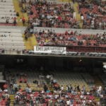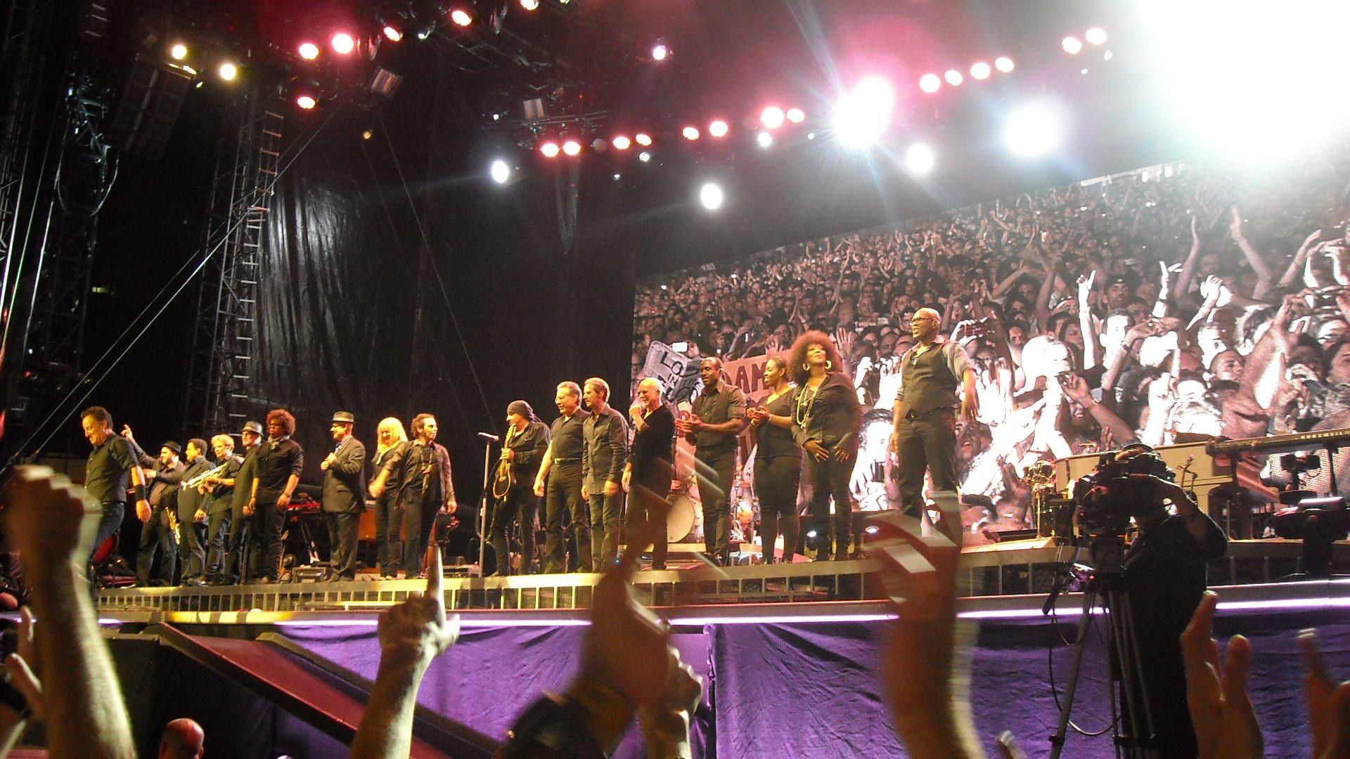 Cancelli aperti, dunque, alle 13 e 30 per i possessori del bracciale al gate 15 e alle 14 e 15 per le persone in fila ai gate 4 e 10 per la zona Prato. A mano a mano lo stadio San Siro si riempie ma c’è un’apparente silenzio. Si trasformerà in attesa snervante poche ore più tardi, quando verso le 18:00 impazienti le persone si sono alzate e posizionate ad hoc fin sotto la transenna, invocando ad alta voce il Boss. Ancora qualche ultimo ritocco, l’ultimo controllo dei rispettivi backliner agli strumenti, la scaletta posizionata a dovere ai piedi del microfono, i tecnici delle luci prendono posto. Ore 20:00 la hola comincia sugli spalti, da un capo all’altro dello stadio, ma ancora niente. Ancora mezz’ora o poco più. Ore 20:35 – la E-Street Band sale sul palco, un membro alla volta, con Steven Van Zandt che precede l’entrata in scena di Bruce Springsteen con il pubblico in delirio, tutto questo mentre Max Weinberg (il batterista) comincia a strapazzare timpani casse e rullante della sua DW sulle note di “We Take Care of Our Own”.