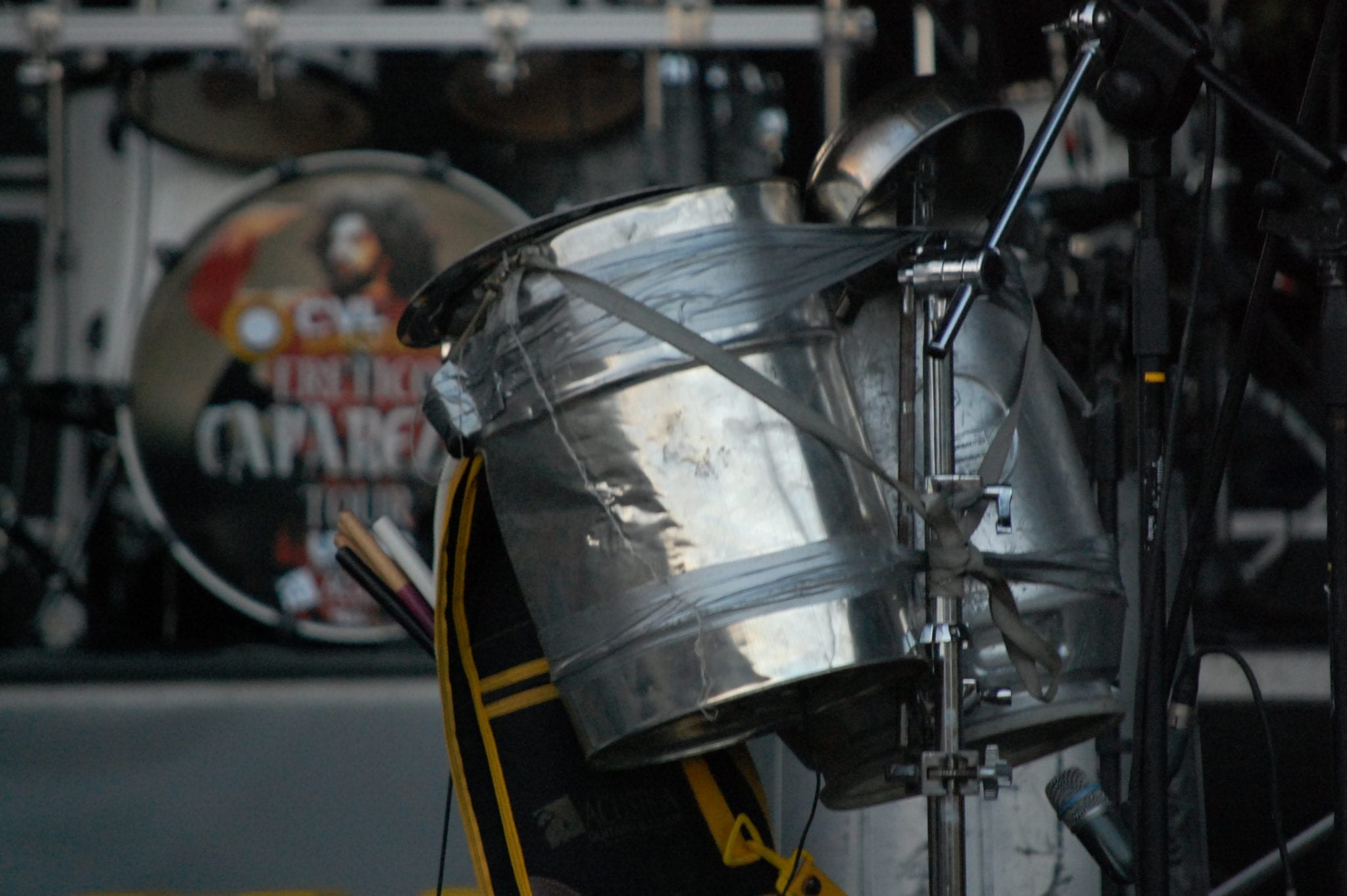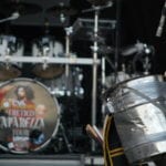 E così si aprono i cancelli alle ore 20:00. Nel frattempo è un continuo via vai di persone che salgono e scendono su e giù il viale che collega la piazza di Giffoni al Campo Sportivo. La maggior parte erano giovani, ma anche famiglie con bambini a seguito (una signora con il marito ed il figlio di appena 3 anni scherzosamente affermano che il desiderio di assistere a questo cocnerto lo ha manifestato il figlio) ed anche una coppia di nonni che volentieri accompagnano i nipotini. Tutti quelli in prima fila attaccati alle transenne erano lì per vedere Caparezza, ma i Capone & BungtBangt non hanno certo subito questo gap. Anzi, si presentano sul palco alle 21 e 30 dopo il saluto da parte del Presidente storico del Giffoni Film Festival – Claudio Gubitosi che si lascia andare dicendo due sole parole che hanno dato un tono diverso alla serata: “Grazie, ragazzi!”; i Capone & Bungt Bangt prendono posizione dietro i loro strumenti artigianali di cui una chitarra costruita con una mazza di scopa e collegata tramite jack all’amplificatore con tanto di 6 corde, una batteria formata da una cassa ricavata con una botte di ferro e riempita all’interno con dei pannelli fono isolanti, un tom ed un timpano ricavati con delle latte di alluminio, un rullante, un charleston ed un crash, un basso, e altre mille cianfrusaglie che fatte suonare nel giusto modo emettevano delle vere e proprie note.