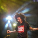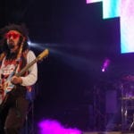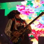 Le trasformazioni si susseguono repentine ed efficaci ed il pubblico balla alzando un polverone da terra (l’unica nota stonata di ieri sera visto l’assenza di pavimentazione sul campo); sull’ultima delle prime dieci canzoni Caparezza sfoggia un abbigliamento hippie ed imbraccia una chitarra parodizzando la figura di Jimi Hendrix che non è fine a sé. Anzi è un invito al pubblico a pensare a quale possa essere il messaggio, il tutto avvalorato dal trasformismo dell’autore dei testi. Un invito a riflettere, insomma. Non solo, parodizza anche sulla figura dei Beatles (vista la chitarra con la cassa raffigurante la bandiera inglese) e sul fenomeno creato. Una generazione sospesa tra un’illusione e una dimenticanza. Ed il gioco riesce davvero bene.