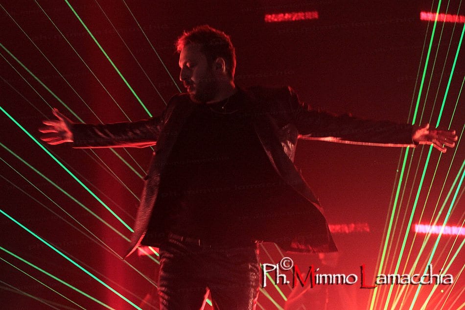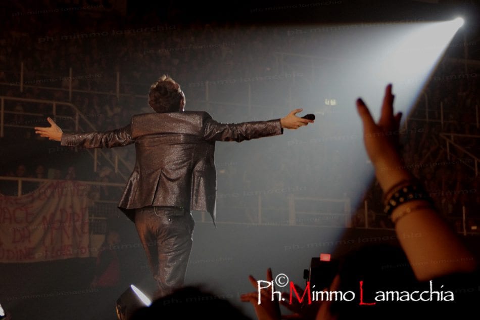 Il palazzetto è un colpo d’occhio eccezionale, pienissimo con i fan in trepida attesa, pronti a cantare e a ballare, ma anche a tifare per la squadra del Bologna calcio, con cori a favore del neo presidente Joè Tacopina, presente in tribuna e grande ammiratore del cantante.
