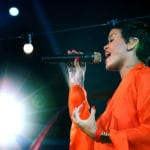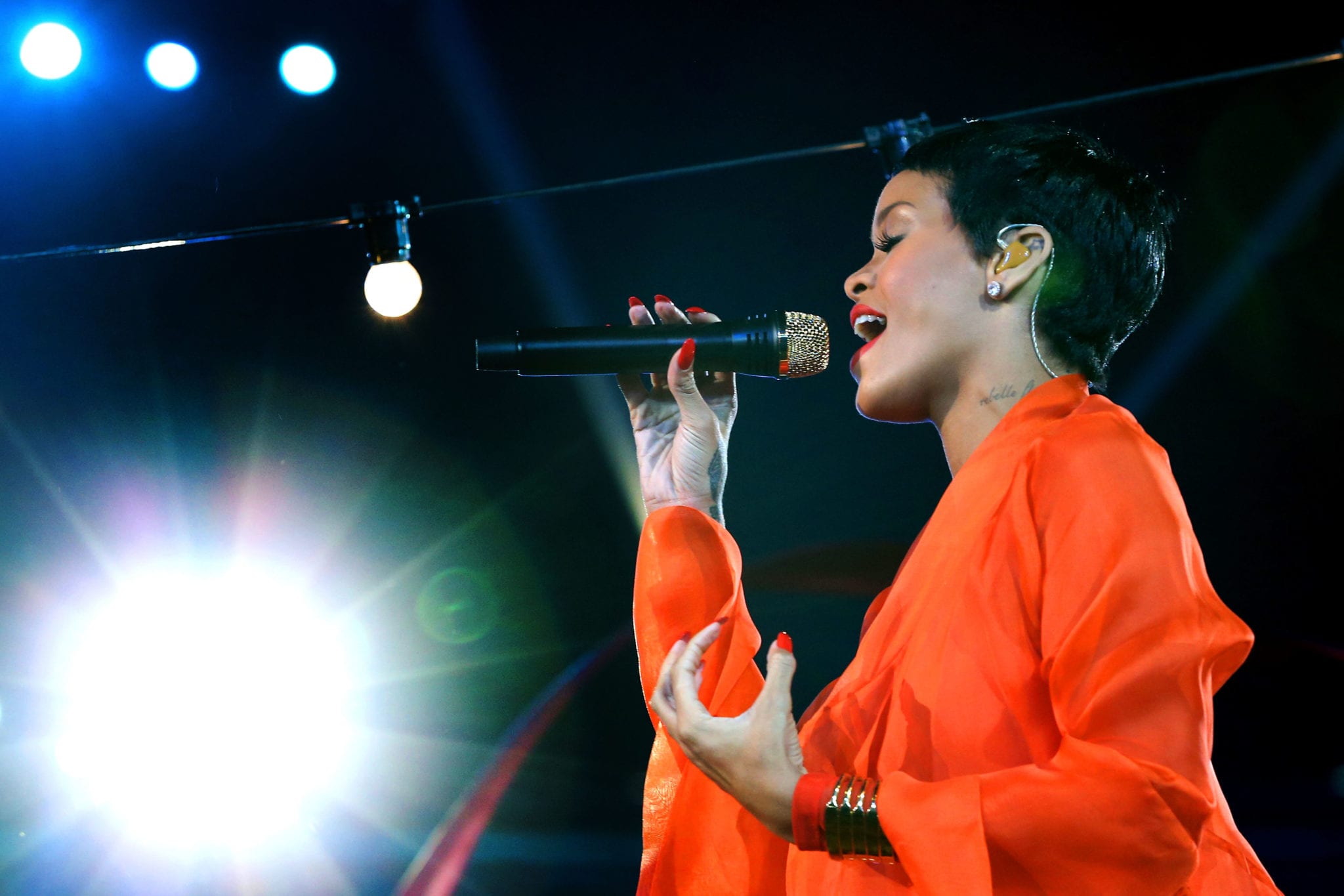 Uno dei momenti più piccanti, però, è avvenuto con l’entrata di Rihanna, che ha stupito tutti per il suo essere troppo vestita rispetto ai propri canoni. La cantante delle Barbados, con capelli cortissimi che avevamo già avuto modo di ammirare agli MTV VMA, è entrata come una regina nascosta da una specie di tunica arancione, con tanto di cappuccio in testa. Rihanna, durante “Princess of China”, si è liberata dell’ingombrante vestiario per rimanere con una camicetta a maniche lunghe arancione unita a larghi pantaloni dello stesso colore; se ci si aspettava la solita “nudità” da Rihanna, di sicuro la sua entrata ha creato un momento di stupore. La cantante ha poi proseguito nel suo show “solitario” cantando sopra un’altalena sospesa nell’aria, il brano che le ha valso la vittoria agli MTV VMA ossia “We Found Love”.