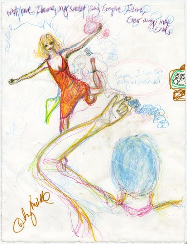 Dalle prime foto che ci giungono dalla mostra, si possono notare figure di donne romantiche ma deluse dalla vita, di donne con il trucco colato, con una espressione triste, malinconica, inquieta. Courtney Love sembra avere una rappresentazione del genere femminile molto preciso e sembra anche amare il termine “pretty” più volte utilizzato nei suoi brani. Ecco che Courtney si disegna o forse disegna semplicemente la sua rappresentazione della donna con una figura che viene ripresa in più e più opere, una figura femminile dai capelli biondi, generalmente con una espressione triste sul volto e quasi esclusivamente nuda o vestita di abiti stracciati.