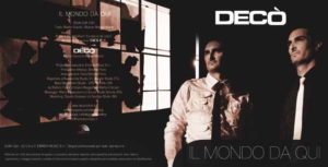 E’ “Il mondo da qui” il nuovo singolo dei Decò tratto dall’ultimo album “La stanza dei colori” pubblicato la scorsa primavera per l’etichetta Emmevi Music/ Self. L’album, prodotto da Stefano Florio, già collaboratore di Lucio Dalla, Frankie Hi Nrg e Luca Bassanese, è stato preceduto dal singolo “Fantastica“, seguito a ruota da “Sospesi nel vento” in Gennaio e “C’è un tempo” a Giugno, pezzo che è entrato nella top 100 del Music control e presentato in popolari tour estivi radiofonici. Decò - Il mondo da qui - artwork “Il mondo da qui” è una ballata dalle atmosfere autunnali che racconta il modo di vedere e vivere la vita. Il video sarà girato a fine Ottobre e sarà trasmesso dai canali televisivi musicali e in rete. “Come sono molti i colori che compongono la nostra musica, così sono tante e di diverse età le persone che ci seguono, cosa molto rara per le band di oggi molto spesso troppo settoriali. Per questo abbiamo pensato fosse arrivato il momento di dar loro la possibilità di conoscersi e confrontarsi, perché no, attraverso la nostra musica” – spiega la band. Per dare spazio ai numerosi fan sempre in crescita i Decò, band vicentina formata dai fratelli Matteo e Marco Visonà, hanno rinnovato il proprio sito ufficiale e inaugurato una nuova pagina su Facebook che vanta già oltre undicimila fan. “Il mondo da qui” può essere ascoltato sul sito ufficiale della band