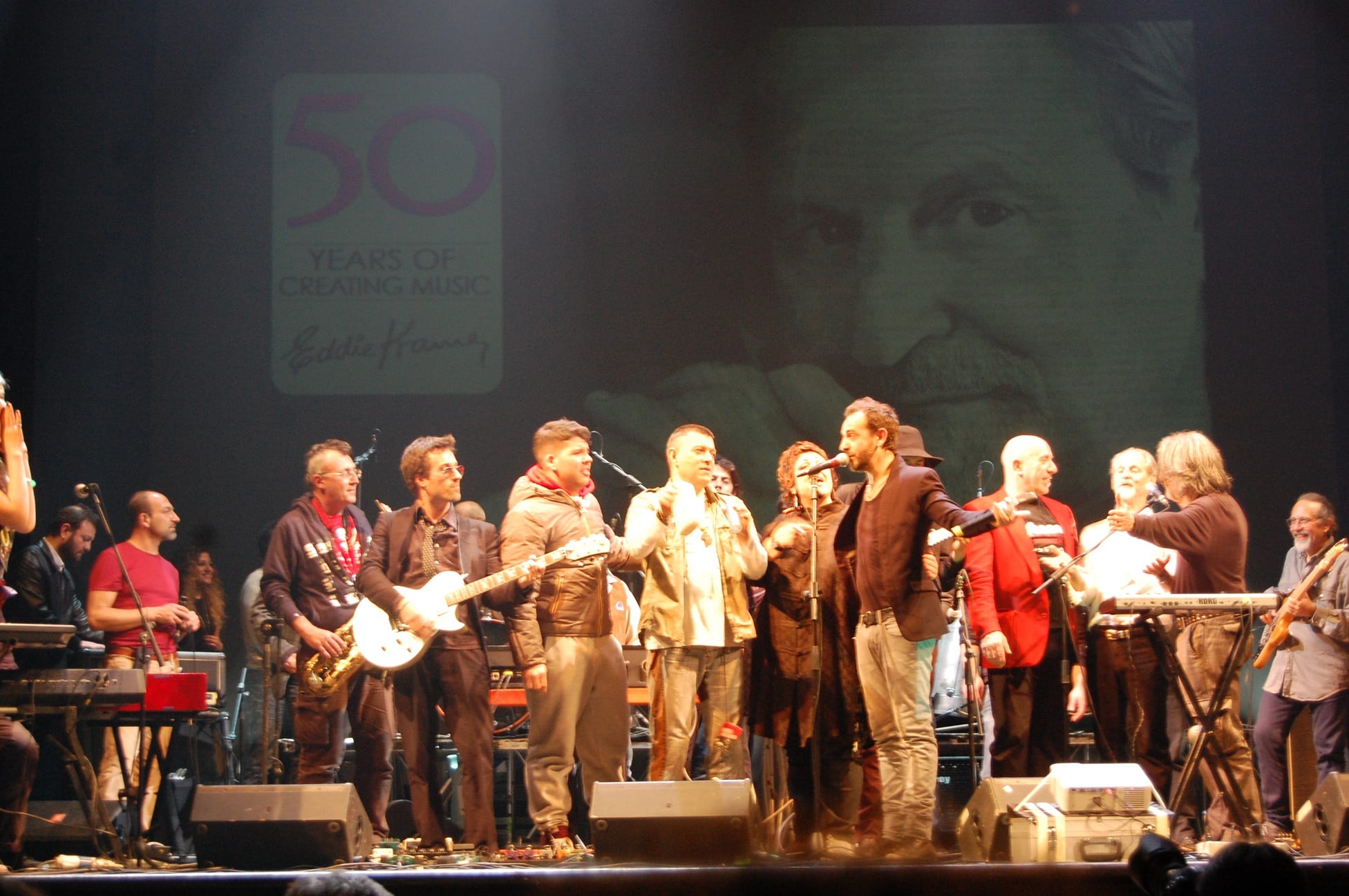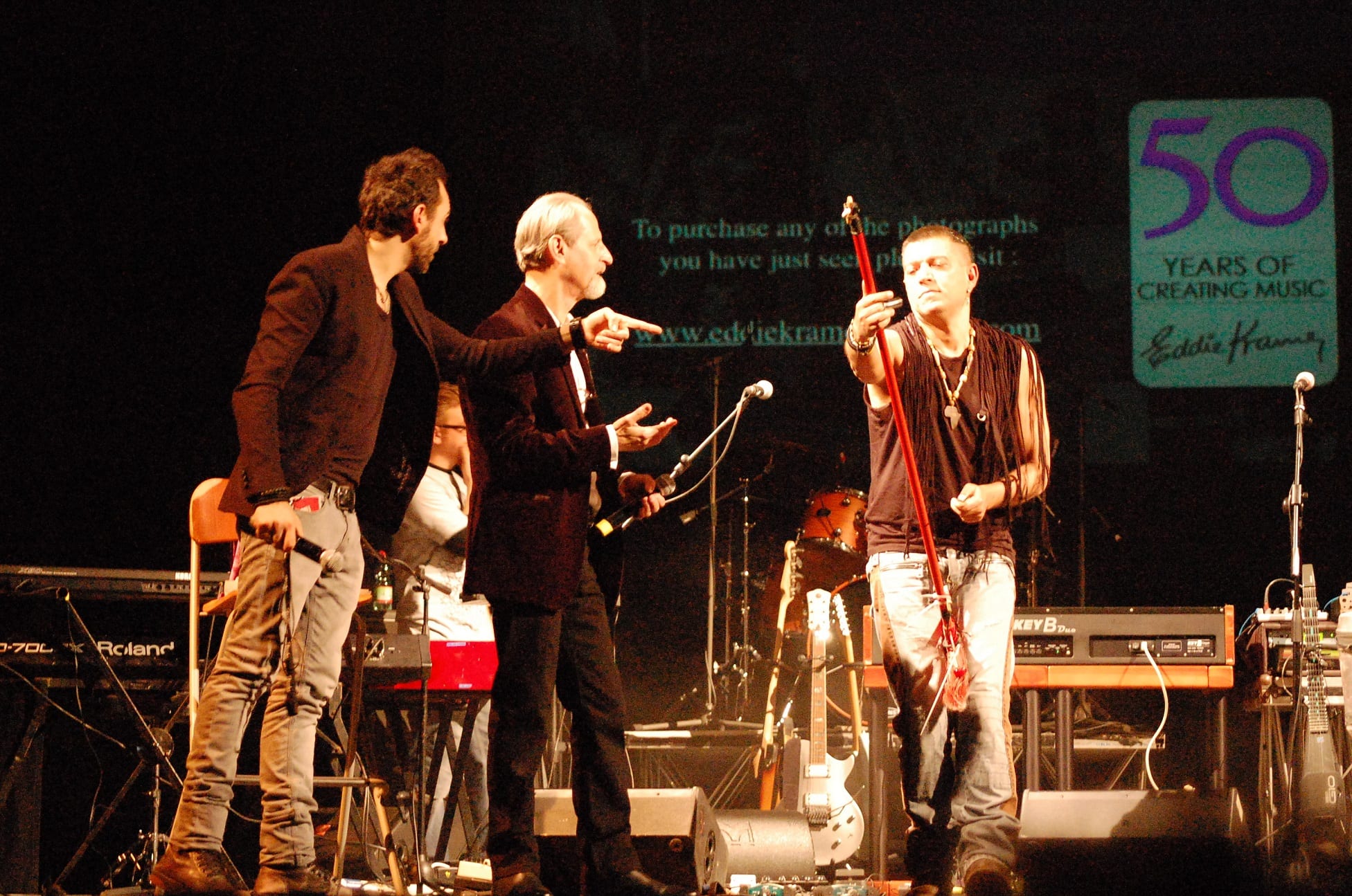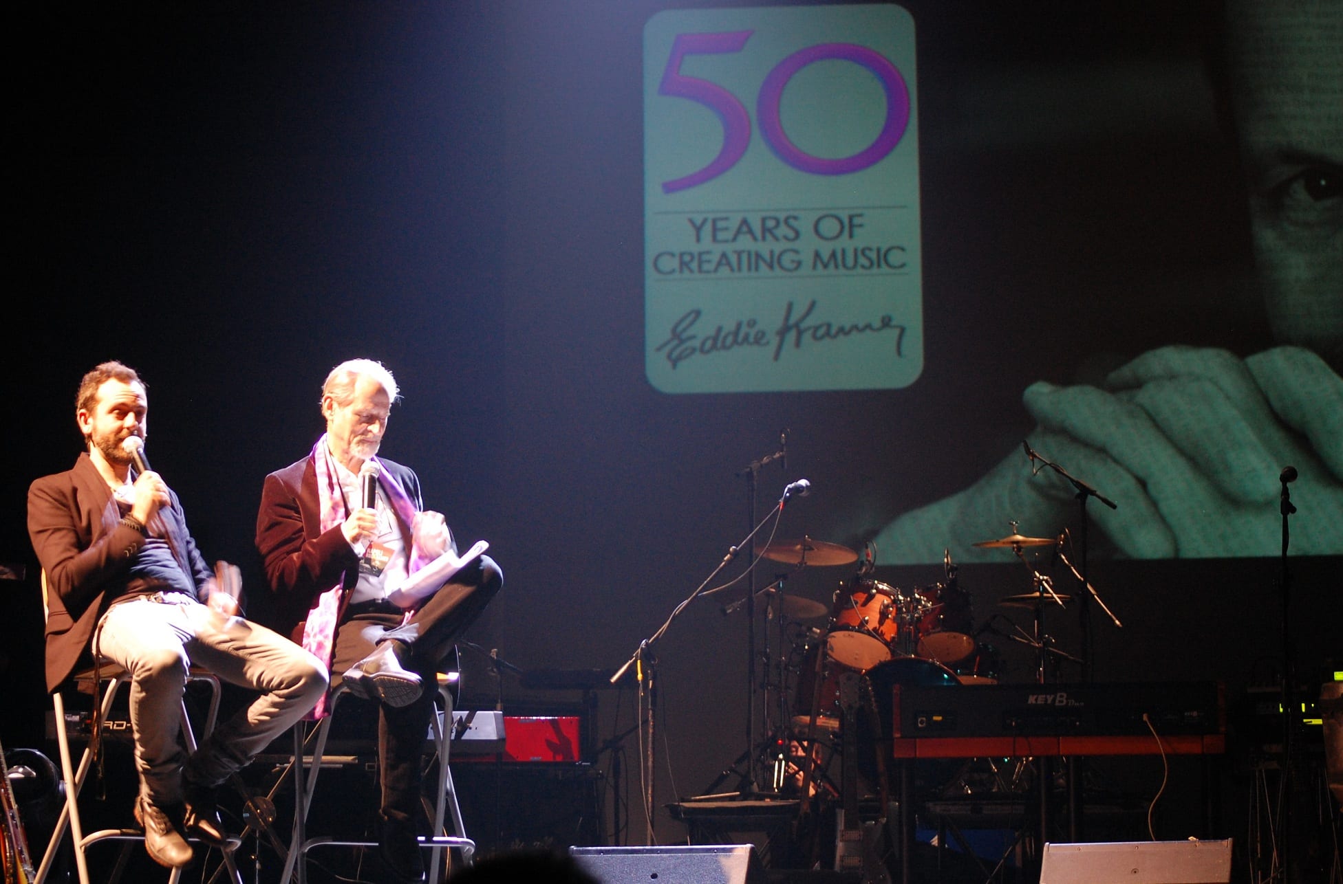 Per ben 3 ore e poco più artisti, musicisti e band si alternano sul palco a partire dalle ore 21:00 per un tributo a Eddie Kramer, seduto nel bel mezzo della platea: il teatro è gremito di persone, tutti in attesa della sua testimonianza. I brani proposti gravitano attorno ai lavori che portano la firma di Mr. Kramer, ma non mancano certo di originalità come la rivisitazione in chiave unplugged a cura di Francesco Forni, un’ entusiasmante versione di “Voodoo Child”, e quella (sempre in chiave unplugged) di “All Along the Watchtower” a cura di Gianni Guarracino. James Senese propone un brano del suo repertorio tra la gioia del pubblico e dello stesso Kramer che piomba sul palco proprio nel bel mezzo della serata. L’atmosfera sembra surreale: luci soffuse, video proiettore, due sedie ed un palco bastano per far rivivere emozioni e retroscena della “Golden Age of Rock”. Non stona affatto qualche nota biografica: la sua avventura di ingegnere del suono ha i suoi prodromi come “Tea Cup Boy”; in pratica portava il thè in sala di registrazione quando era impiegato agli Advision Sound Studios. La sua passione per la fotografia, ancora, gli ha permesso di immortalare attimi di storia che ha ben pensato di raggruppare nel suo sito ufficiale ricco di materiale e racconti, proprio in occasione del 50mo anniversario di carriera.