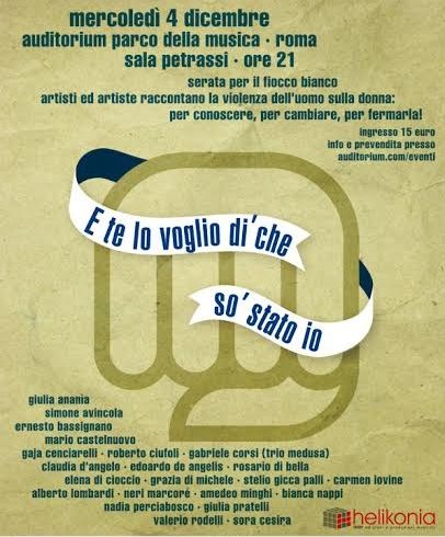 Mercoledì 4 Dicembre l’Auditorium Parco della Musica ospiterà un’importante manifestazione contro il femminicidio che si lega al Fiocco Bianco nella giornata internazionale degli uomini che prendono la parola contro la violenza di genere. L’evento si intitola “E te lo voglio dì che so’ stato io” e ha già raccolto il consenso e il supporto di importanti nomi della musica, del cinema e del teatro: Neri Marcoré, Amedeo Minghi, Elena Di Cioccio, Edoardo De Angelis, Roberto Ciufoli, Gabriele Corsi (Trio Medusa), Grazia Di Michele, Giulia Ananìa, Simone Avincola, Ernesto Bassignano, Mario Castelnuovo, Gaja Cenciarelli, Claudia D’Angelo, Rosario Di Bella, Stelio Gicca Palli, Giulia Pratelli, Carmen Iovine, Alberto Lombardi, Bianca Nappi, Nadia Perciabosco, Valerio Rodelli, Sora Cesira. L’appuntamento è a Roma alle ore 21 presso la sala Pretassi (Auditorium Parco della Musica).