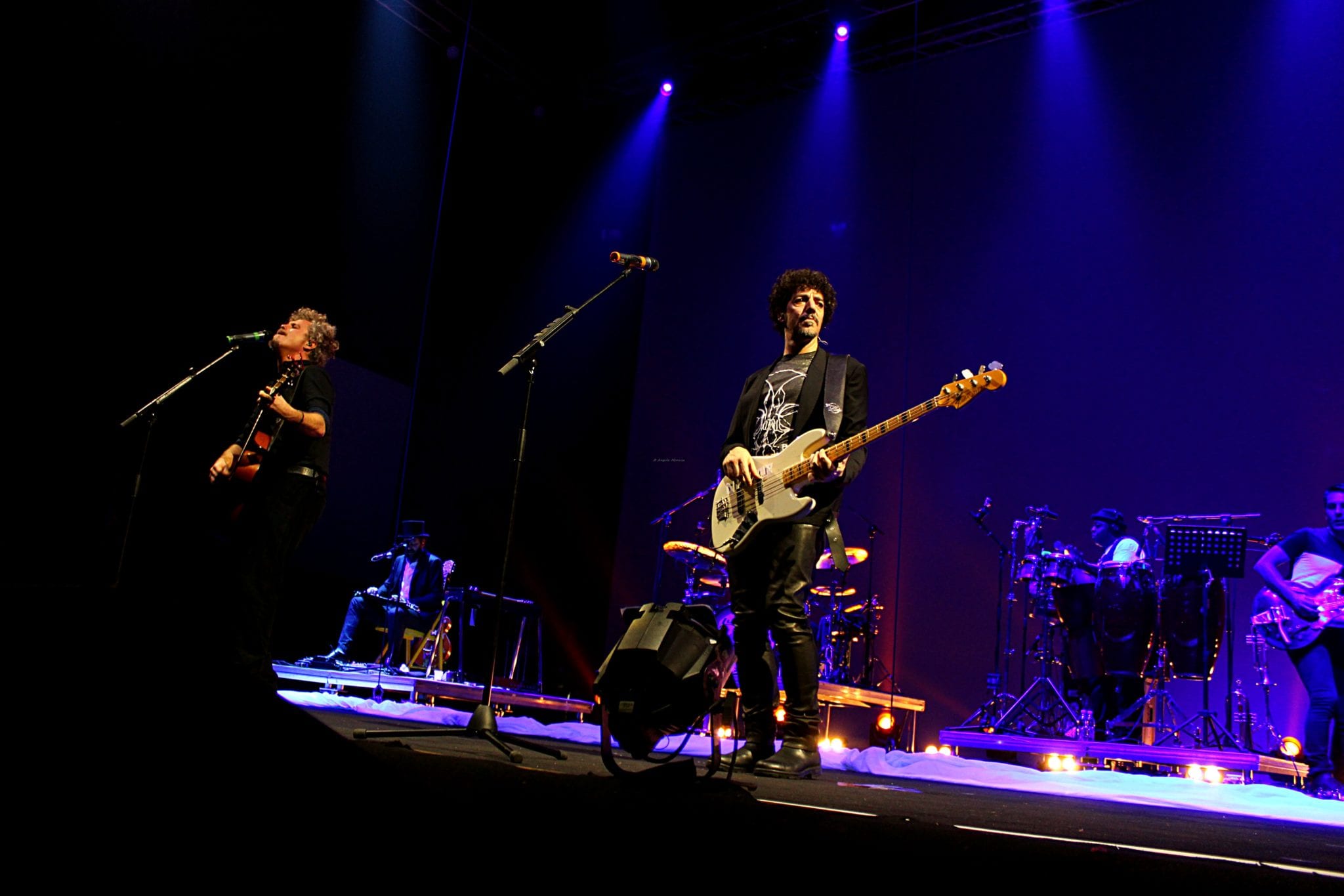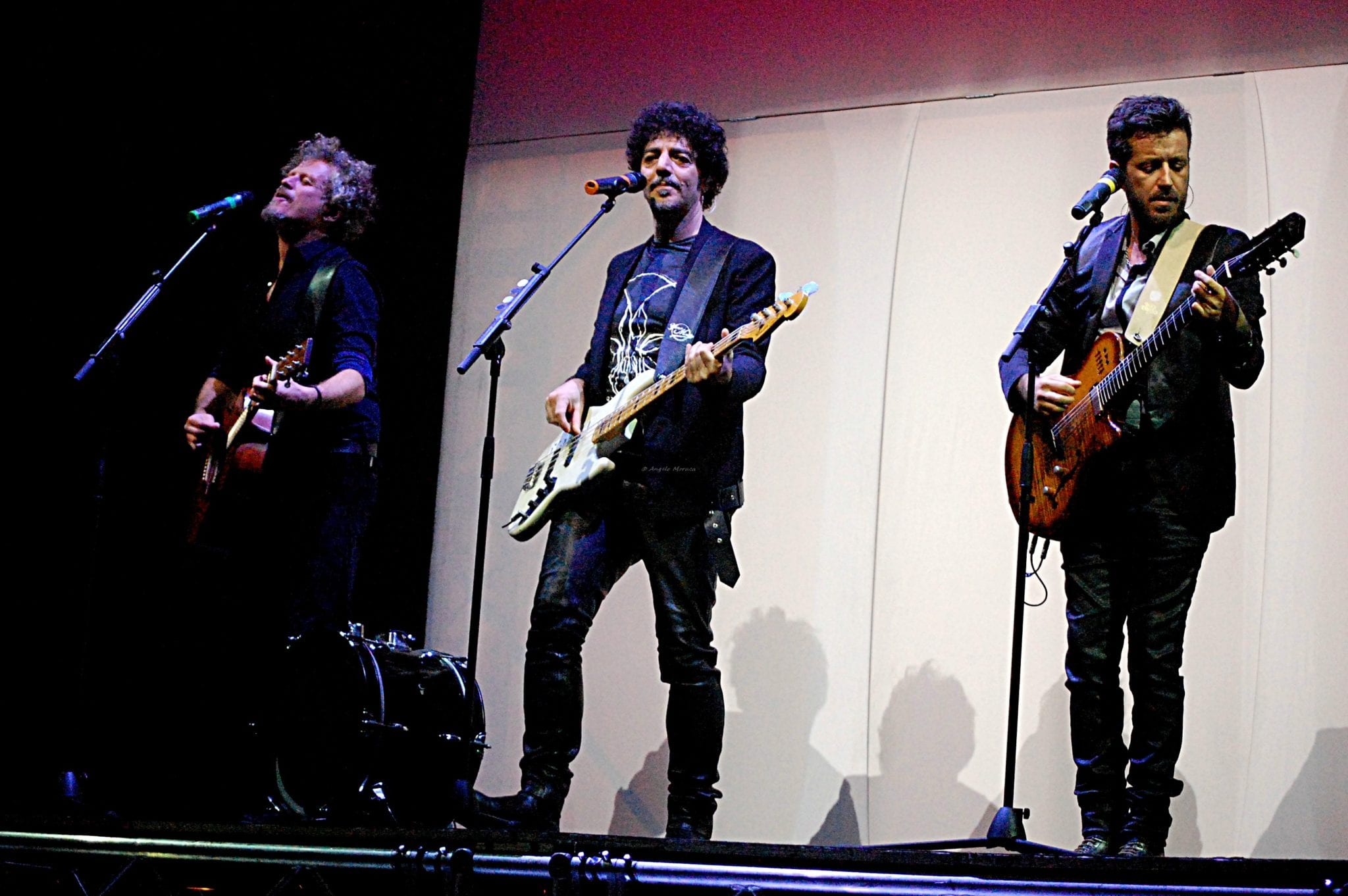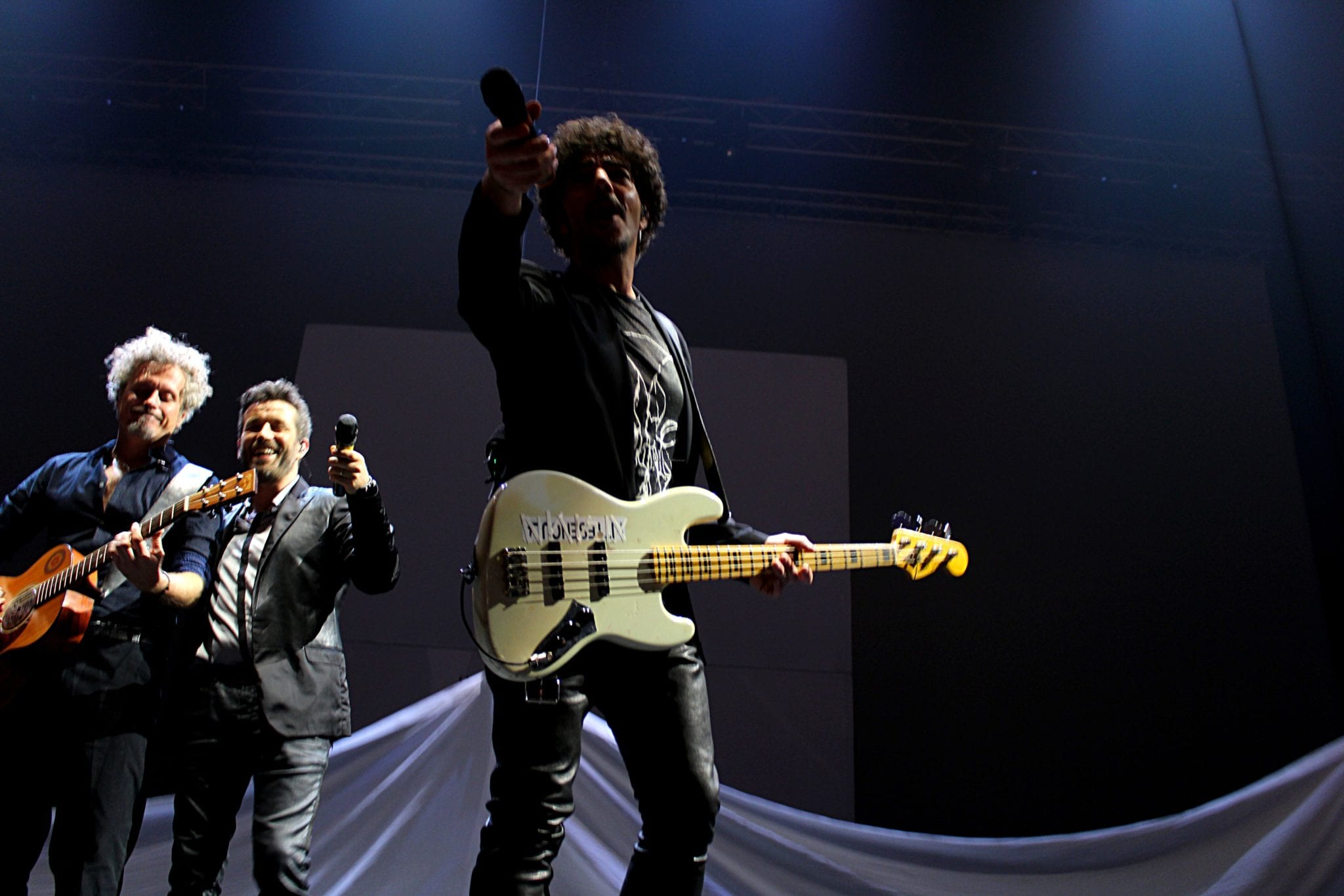 Inizio molto soft con “Alzo le mani” canzoni molto significativa estratta dall’album del trio, mani chitarre (basso) e voce. Menestrelli DOC. Poi via in salita con “Occhi da Orientale” (Silvestri), “Una buona idea” (Fabi), “Il timido ubriaco” (Gazzè), “A bocca chiusa” (Silvestri), “Il solito sesso” (Gazzè), “È non è” (Fabi). Stop. È tempo di rompere il ghiaccio, il riscaldamento è finito, si scende dalla pedana e si poggia “il culo sulla pietra de il padrone della festa”. La band suona e suona bene, Roberto Angelini (chitarre), Massimo de Domenico (polistrumentista), Gianluca Misiti (tastiere), Piero Monterisi (batteria), Josè Ramon Caraballo Armas (percussioni e tromba) e Adriano Viterbini dei Bud Spencer Blues Explosion (chitarra) raggiungono i tre sul palco e…