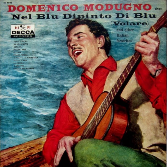 Il brano, scritto nel 1958 da Modugno con Franco Migliacci e cantato da “Mimì” per la prima volta al Festival di Sanremo 1958 in coppia con Johnny Dorelli, fu vincitore di quell’edizione e da lì ottenne un successo planetario, fino a diventare una delle canzoni italiane più famose nel mondo e con il maggiore riscontro commerciale. La parola che apre il ritornello, Volare, divenuta identificativa della canzone, è stata depositata alla SIAE come titolo alternativo della stessa. “Nel blu dipinto di blu” partecipò anche all’Eurovision Song Contest 1958 classificandosi al terzo posto. In Italia è risultato essere il singolo italiano più venduto nel 1958 e negli Stati Uniti è stata prima in classifica per 5 settimane, l’unica volta per una canzone italiana, vendendo più di 22 milioni di copie nel mondo e vincendo due Grammy come Canzone dell’anno (“Song of the year”) e come Disco dell’anno (Record of the year).