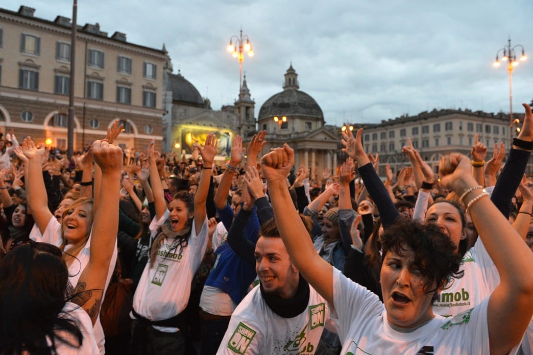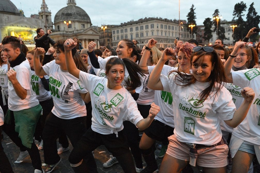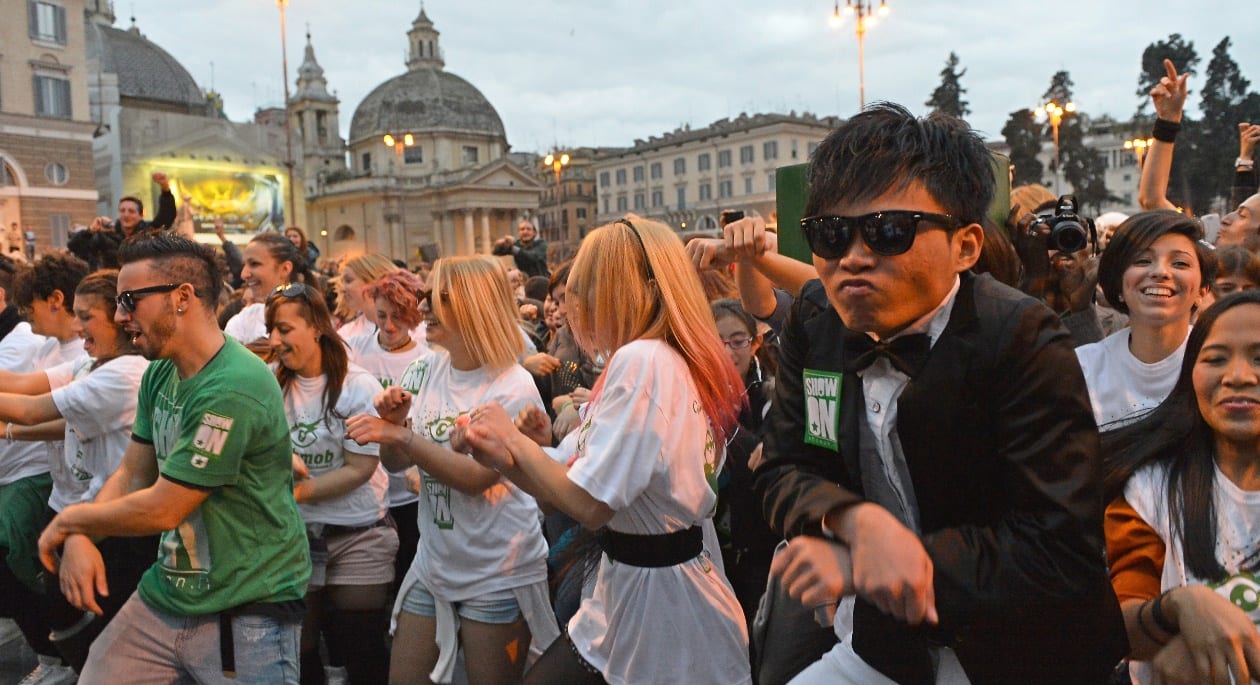 Solo qualche giorno fa abbiamo parlato dei 20mila riuniti al Trocadero a Parigi, davanti alla Tour Eiffel, per muoversi a passo di Gangnam Style e ora la tendenza contagiosa della danza è giunta fino in Italia, precisamente a Roma dove in Piazza del Popolo si sono riunite ben 30mila persone. Il rapper sudcoreano Psy di certo ha fatto un grande colpo con questo brano che sta facendo discutere, ballare, divertire ma anche polemizzare l’intero globo. Il “Gangnam Style” è uno dei successi dell’anno, hit di tutte le classifiche musicali più note a livello mondiale, sta creando davvero una vera e propria moda. La capitale italiana nella giornata del 10 Novembre è stata invasa da 30mila appassionati che hanno aderito al flash mob che, in breve, consiste in un evento organizzato “velocemente” da qui appunto flash, dove un gruppo di persone decide di organizzarsi per uno scopo, come in questo caso onorare il brano e divertire la massa di curiosi e appassionati. In questo caso, l’evento romano è stato contraddistinto anche da un passaparola via web molto efficace; già da giorni, infatti, si era a conoscenza di questo flashmob con Gangnam Style perfettamente riuscito.