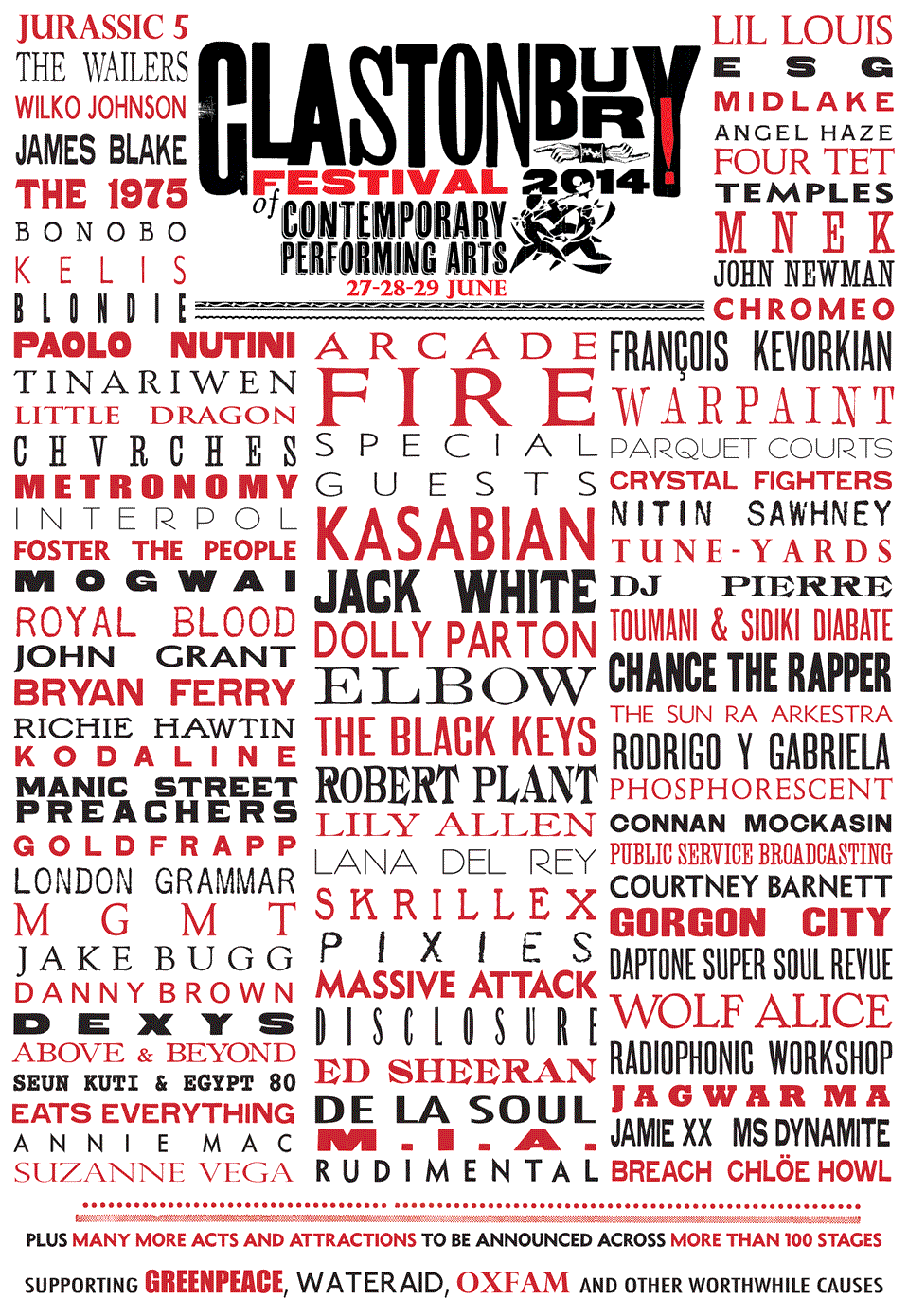 La line-up ufficiale di Glastonbury 2014 è stata annunciata, dunque non prendente impegni perché dal 27 al 29 Giugno 2014 grandi nomi si alterneranno sul palco inglese più ambito del momento. Il festival ormai è diventato una garanzia in Europa, e in aggiunta ad altri è la valida alternativa che non ha nulla da invidiare a grandi nomi oltreoceano. A calcare il palco quest’anno saranno grandi nomi della discografia contemporanea ma anche nomi appartenenti a vecchi successi, ma non solo musica, tanta arte e performance arricchiranno la proposta musicale di Gastonbury. Arcade Fire, The Black Keys, Kasabian, Robert Plant, Massive Attack ,Lily Allen, M.I.A., Kodaline e Goldfrapp sono alcuni dei nomi apparsi nella line-up annunciata proprio poche ore fa, e saranno ancora tanti i nomi a rendere giustizia ad un cartellone già così promettente.
