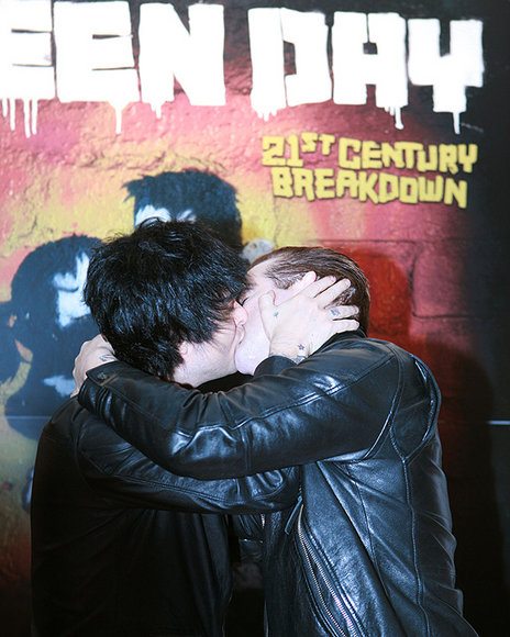 I Green Day stanno riscuotendo un enorme successo con “21st Century Breakdown” ed hanno trovato un modo molto singolare per esprimere la loro gioia. Il cantante Billie Joe Armstrong e il batterista Tré Cool per festeggiare si sono dati un sensuale bacio sulla bocca che riprende l’artwork di “21st Century Breakdown“. Eccovi la foto dell'”evento”.