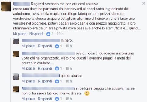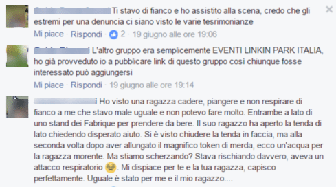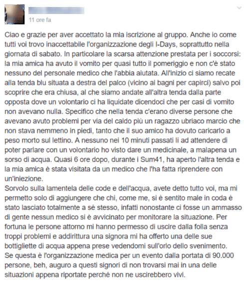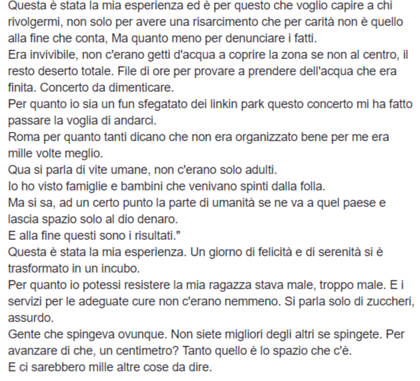 Leggendo le numerose testimonianze sul gruppo, che conta oltre 300 membri, la giornata peggiore è stata quella del 17 giugno, vale a dire il giorno in cui si sono esibiti i Linkin Park, i Blink 182 e i Sum 41. “Già a partire dalle ore 18, nonostante le note condizioni climatiche e del terreno, i punti di ristoro hanno iniziato a dichiarare l’esaurimento delle scorte di acqua” scrive Lorenzo, sottolineando anche di come il sequestro preventivo dei tappi delle bottiglie non permetta di fare scorte adeguate. Ricordiamo una cosa agli organizzatori e a chi forse a un concerto non ci è mai andato: si rimane per ore in piedi nello stesso posto e c’è chi si mette in fila la notte precedente per guadagnarsi la postazione migliore da cui godersi lo spettacolo, non c’è tempo e nemmeno il modo, vista la folla, di andare avanti e indietro per comprare bottigliette d’acqua. La soluzione, ancora una volta, rimangono gli abusivi che passano in mezzo alla gente. Il risultato di tutto questo lo si può vedere in questo video.