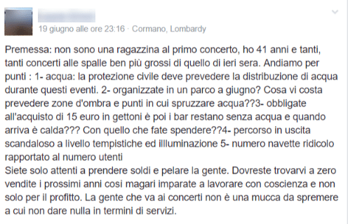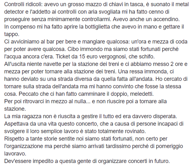 Il disagio può essere considerato a 360° perché le lamentele, com’era prevedibile, riguardano anche i servizi igienici: “Nonostante le lunghe attese per l’accesso, non c’era alcuna possibilità di sostare all’ombra, di acquistare beni primari (soprattutto acqua) né tantomeno di ottenerli in forma gratuita, così come assenti erano i servizi igienici e il personale sanitario“. Come spesso accade e non dovrebbe accadere, i servizi igienici erano limitati numericamente e malfunzionanti, come riporta una ragazza: “Altra cosa assolutamente vergognosa: neanche una fontanella in tutta l’area e i bagni chimici non avevano neanche un rubinetto funzionante perché mancava l’allaccio all’acqua (cosa confermata dagli steward, e ho chiesto a più di uno)“. Ovviamente la sua è solo una delle numerose testimonianze, se ci stiamo occupando di questo tema in maniera sempre più approfondita è proprio perché le presenze erano altissime e la disorganizzazione è stata imperdonabile.
